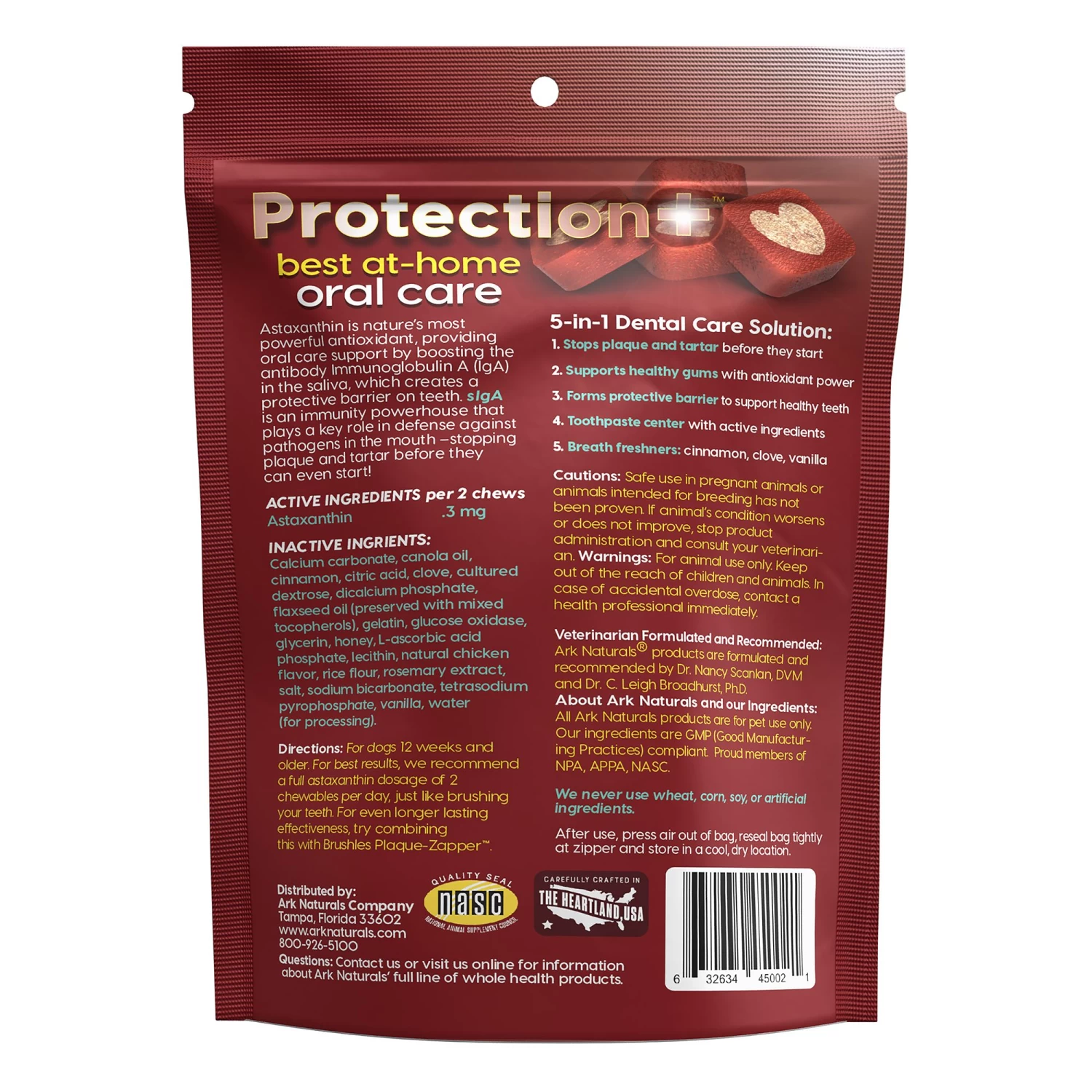 Ark Naturals Protection+ Brushless Toothpaste is the only dental chew that stops plaque and tartar before they start! Powered by nature’s most powerful antioxidant: Astaxanthin! Astaxanthin stops plaque and tartar before it can even start by boosting the antibody immunoglobulin A (lgA) in the saliva, therefore creating a protective barrier on teeth! These unique 5-in-1 dental chews have a toothpaste center with active ingredients and natural breath fresheners such as cinnamon, clove and vanilla. They also support gums with antioxidant power and form a protective barrier to support healthy teeth.