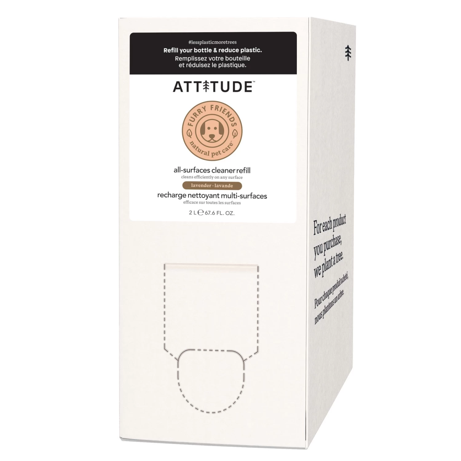 Attitude Bulk 2L All Surface Cleaner is ideal for hard surfaces frequented by pets. This surface cleaner with a light natural lavender scent deodorizes floors without leaving residues. Made from performant plant- and mineral-based ingredients. For the box: To release the spigot, push in the cardboard tab (applying pressure on the inside edges of the dotted area). Pull the spigot out of the opening and push the tab back in to hold it in place. Carefully remove the safety seal from the valve by pulling on the small red stem. Gently press the top of the spigot with your thumb. Make sure that any receptacles you want to fill are clean and dry. If necessary, use a funnel to make it easier to pour the liquid.