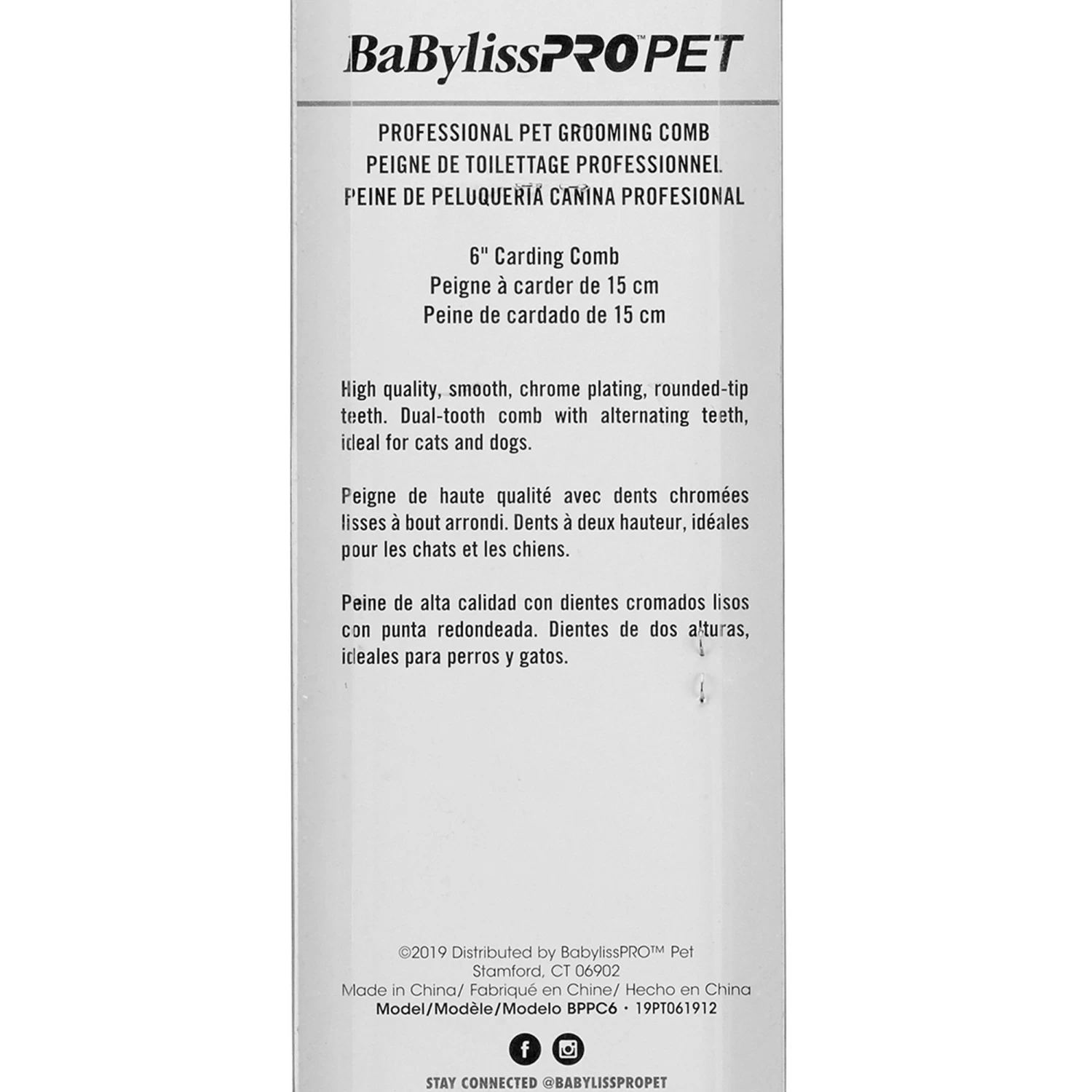 The Conair BaBylissPRO PET 6-Inch Cat/Dog Carding Comb features alternating teeth that easily glide through your pet’s coat to remove knots and tangles. Keep your pet’s coat looking its best with this easy-to-use product.
