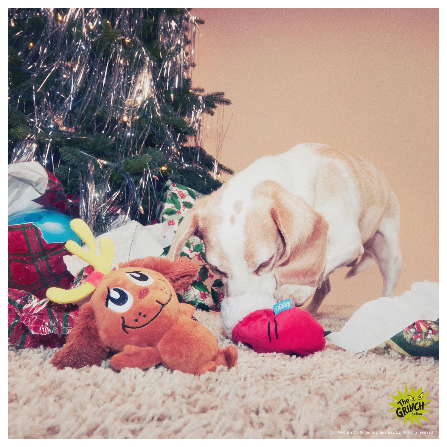 This Christmas stocking dog toy is filled to the Max with comfort and toys! Max’s Stuffed Stocking is two toys in one and two squeakers to boot for double the fun. So add treats or kibble for a late-night nibble, and Max’s stocking will be stink! Stank! STUFFED!