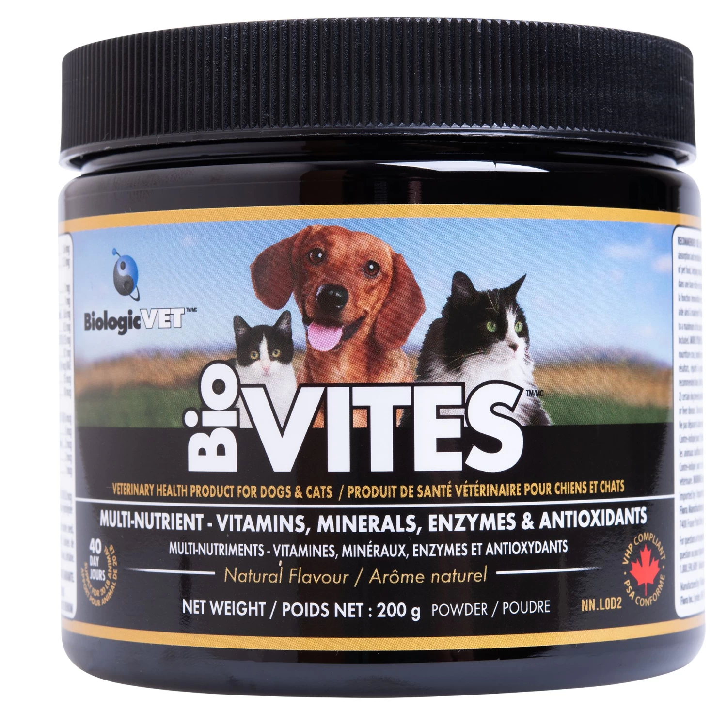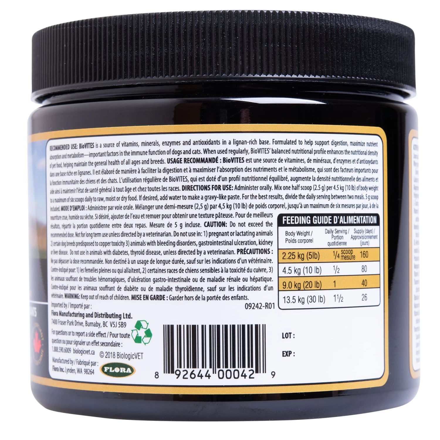 Use: BioVITES is a source of vitamins, minerals, enzymes and antioxidants in a lignan-rich base. Formulated to help support digestion, maximize nutrient absorption and metabolismâimportant factors in the immune function of dogs and cats. When used regularly, BioVITESâ balanced nutritional profile enhances the nutritional density of pet food, helping maintain the general health of all ages and breeds.
