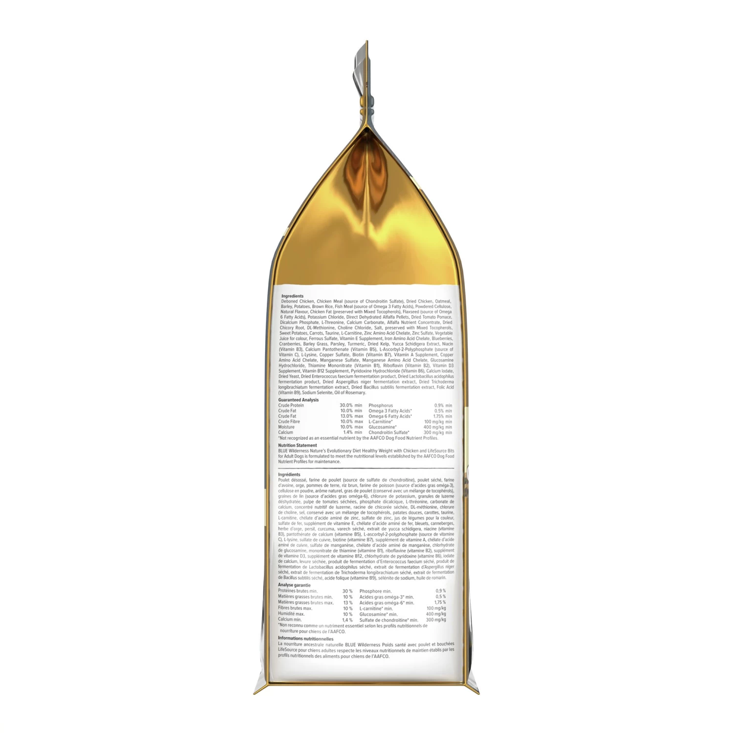 Deboned Chicken, Chicken Meal (source of Chondroitin Sulfate), Dried Chicken, Oatmeal, Barley, Potatoes, Brown Rice, Fish Meal (source of Omega 3 Fatty Acids), Powdered Cellulose, Natural Flavour, Chicken Fat (preserved with Mixed Tocopherols), Flaxseed (source of Omega 6 Fatty Acids), Potassium Chloride, Direct Dehydrated Alfalfa Pellets, Dried Tomato Pomace, Dicalcium Phosphate, L-Threonine, Calcium Carbonate, Alfalfa Nutrient Concentrate, Dried Chicory Root, DL-Methionine, Choline Chloride, Salt, preserved with Mixed Tocopherols, Sweet Potatoes, Carrots, Taurine, L-Carnitine, Zinc Amino Acid Chelate, Zinc Sulfate, Vegetable Juice for colour, Ferrous Sulfate, Vitamin E Supplement, Iron Amino Acid Chelate, Blueberries, Cranberries, Barley Grass, Parsley, Turmeric, Dried Kelp, Yucca Schidigera Extract, Niacin (Vitamin B3), Calcium Pantothenate (Vitamin B5), L-Ascorbyl-2-Polyphosphate (source of Vitamin C), L-Lysine, Copper Sulfate, Biotin (Vitamin B7), Vitamin A Supplement, Copper Amino Acid Chelate, Manganese Sulfate, Manganese Amino Acid Chelate, Glucosamine Hydrochloride, Thiamine Mononitrate (Vitamin B1), Riboflavin (Vitamin B2), Vitamin D3 Supplement, Vitamin B12 Supplement, Pyridoxine Hydrochloride (Vitamin B6), Calcium Iodate, Dried Yeast, Dried Enterococcus faecium fermentation product, Dried Lactobacillus acidophilus fermentation product, Dried Aspergillus niger fermentation extract, Dried Trichoderma longibrachiatum fermentation extract, Dried Bacillus subtilis fermentation extract, Folic Acid (Vitamin B9), Sodium Selenite, Oil of Rosemary