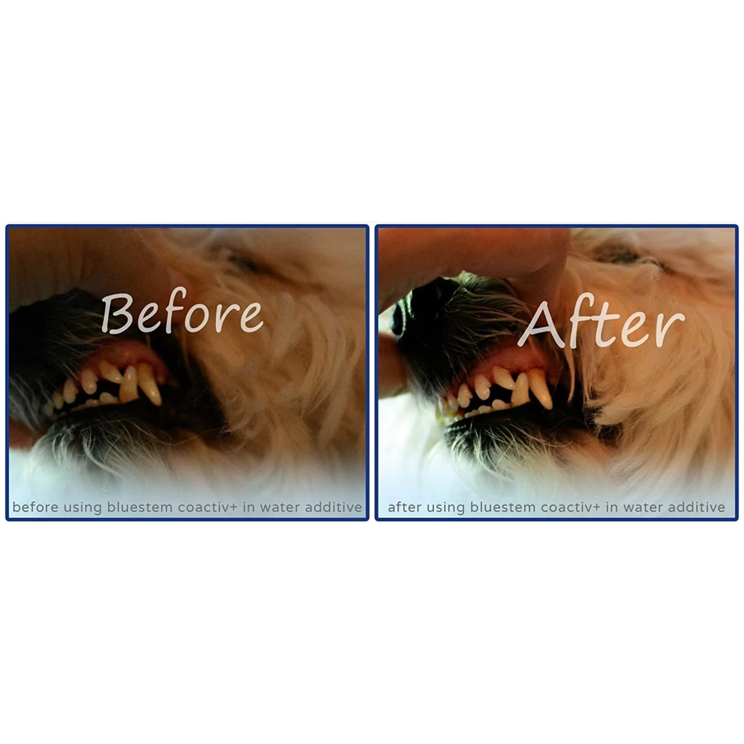 Bluestem oral care water additive with coactiv+ is scientifically formulated to freshen breath, fight plaque and tartar, and promote good oral hygiene. In an independent, Good Clinical Practice Efficacy study, dogs were given Bluestem water additive in their daily drinking water, and by 84 days showed a 25.4% reduction in tartar – without even brushing!