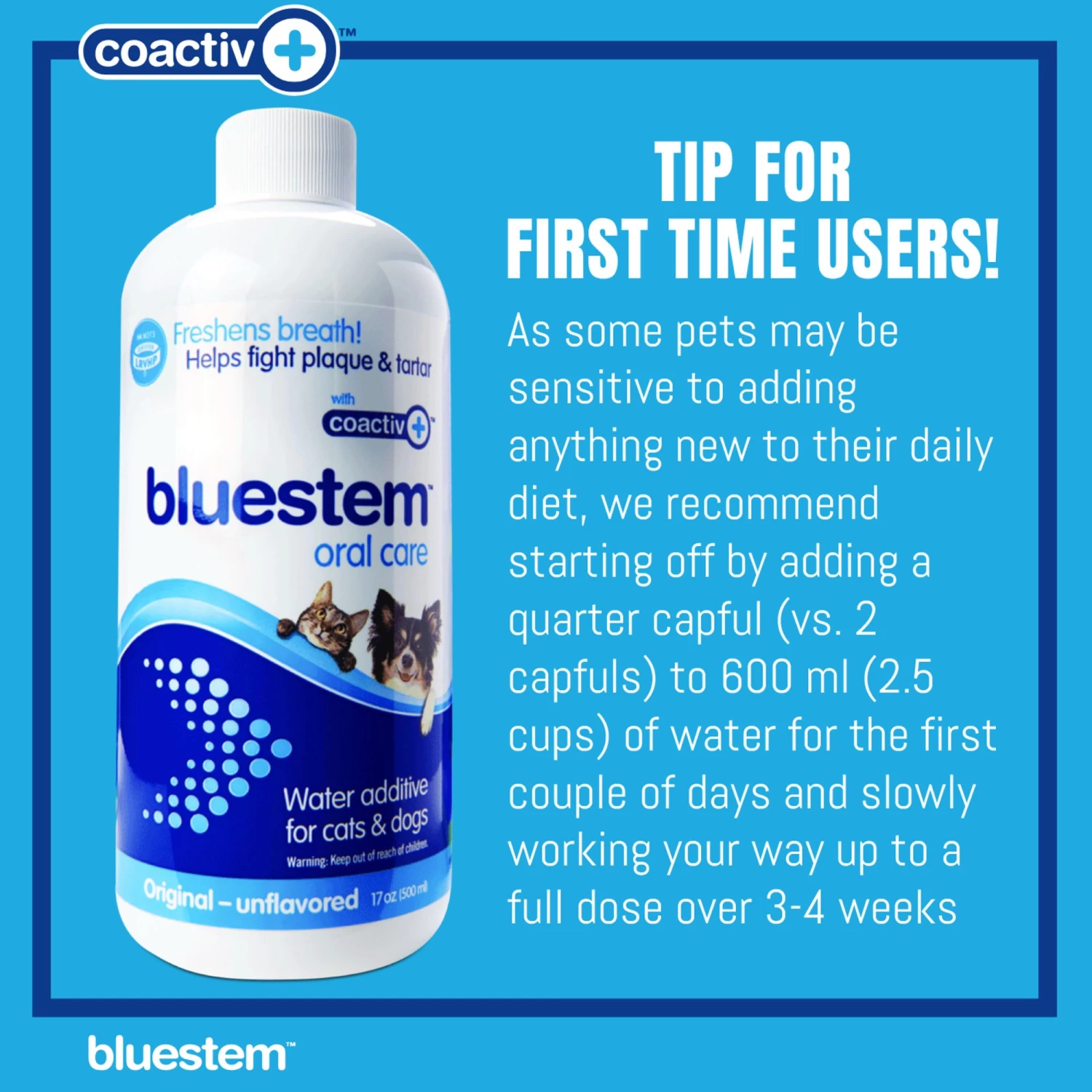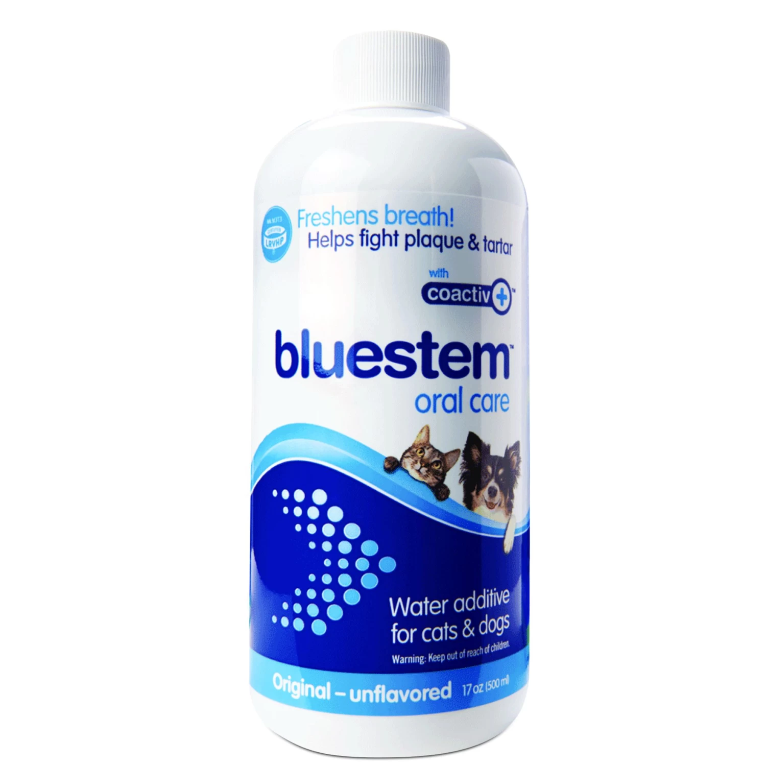 Bluestem oral care water additive with coactiv+ is scientifically formulated to freshen breath, fight plaque and tartar, and promote good oral hygiene. In an independent, Good Clinical Practice Efficacy study, dogs were given Bluestem water additive in their daily drinking water, and by 84 days showed a 25.4% reduction in tartar – without even brushing!