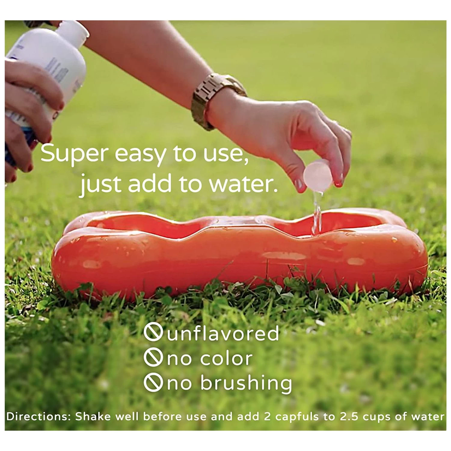 Shake well before use and add 2 capfuls to 2-1/2 cups (600ml) of your pet’s drinking water (1 capful is 10ml) every time you refill the bowl. Use as directed for best results.