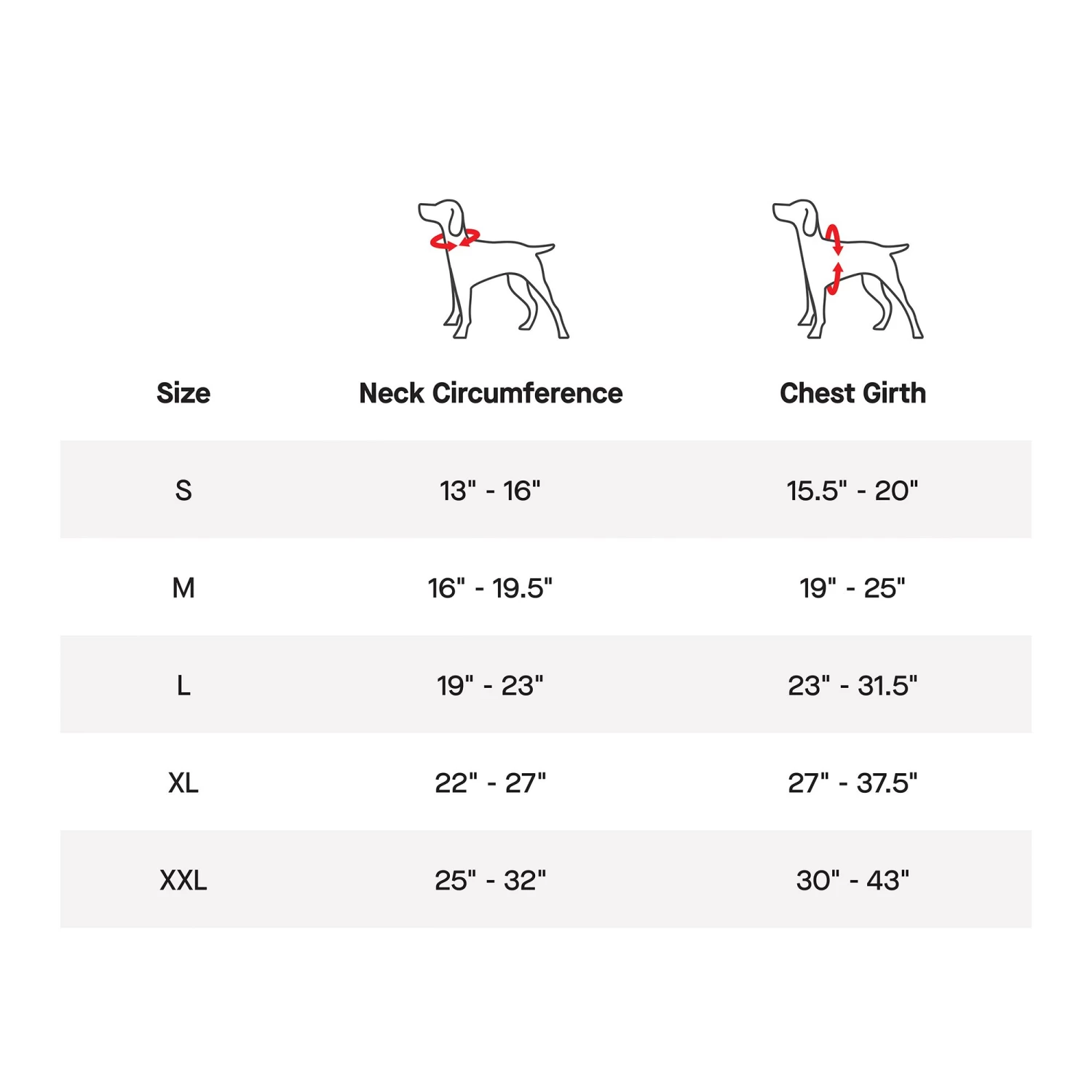 XX-Large: Neck Girth: 25-32 in; Chest Girth: 30 in-43 in