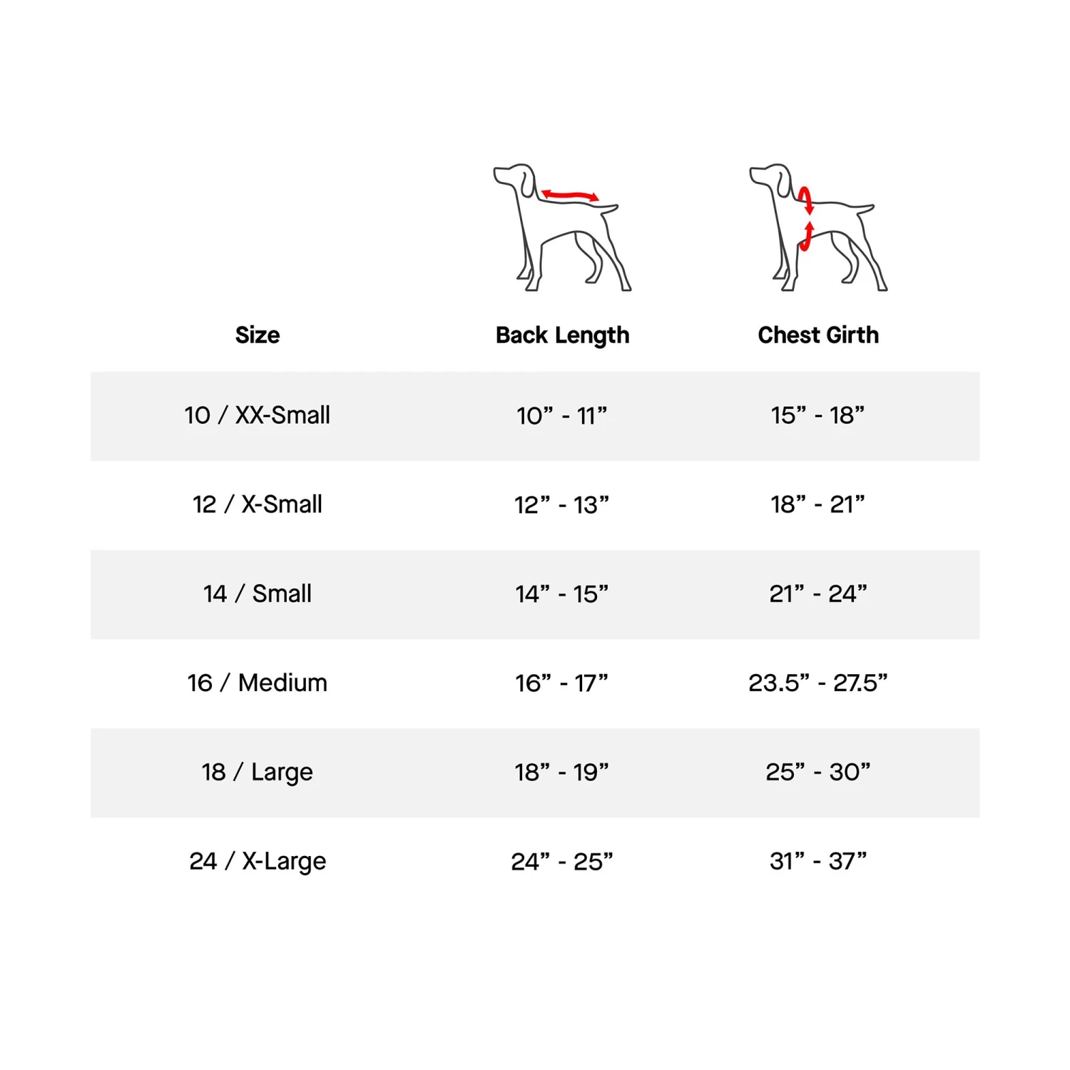 XX-Small: Back Length: 10-11 in; Chest Girth: 14.5-17.5 in