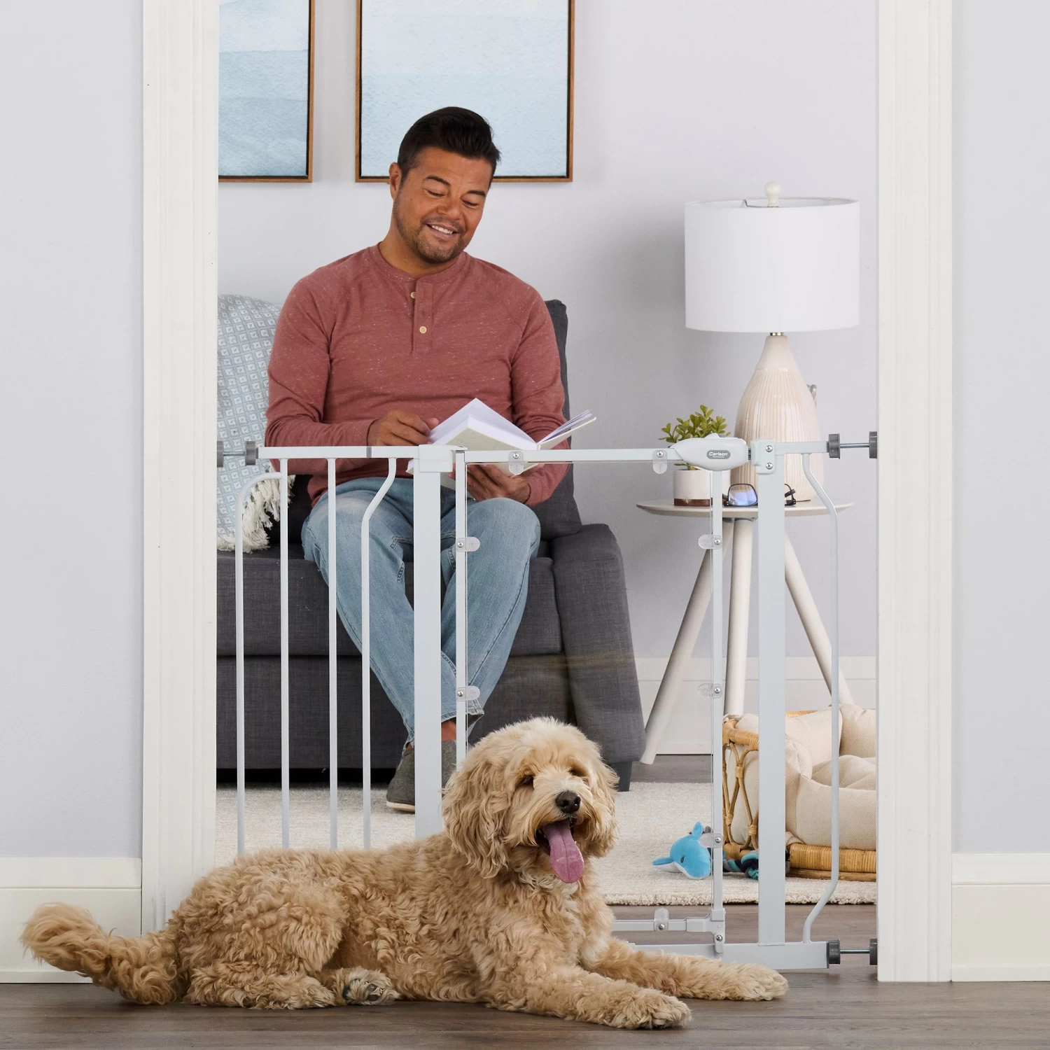 The Carlson Acrylic Extra Wide Walk-Thru Pet Gate is a convenient, chew-proof way to contain and protect both your pet and home. The gate is made of an all-steel frame and a clear