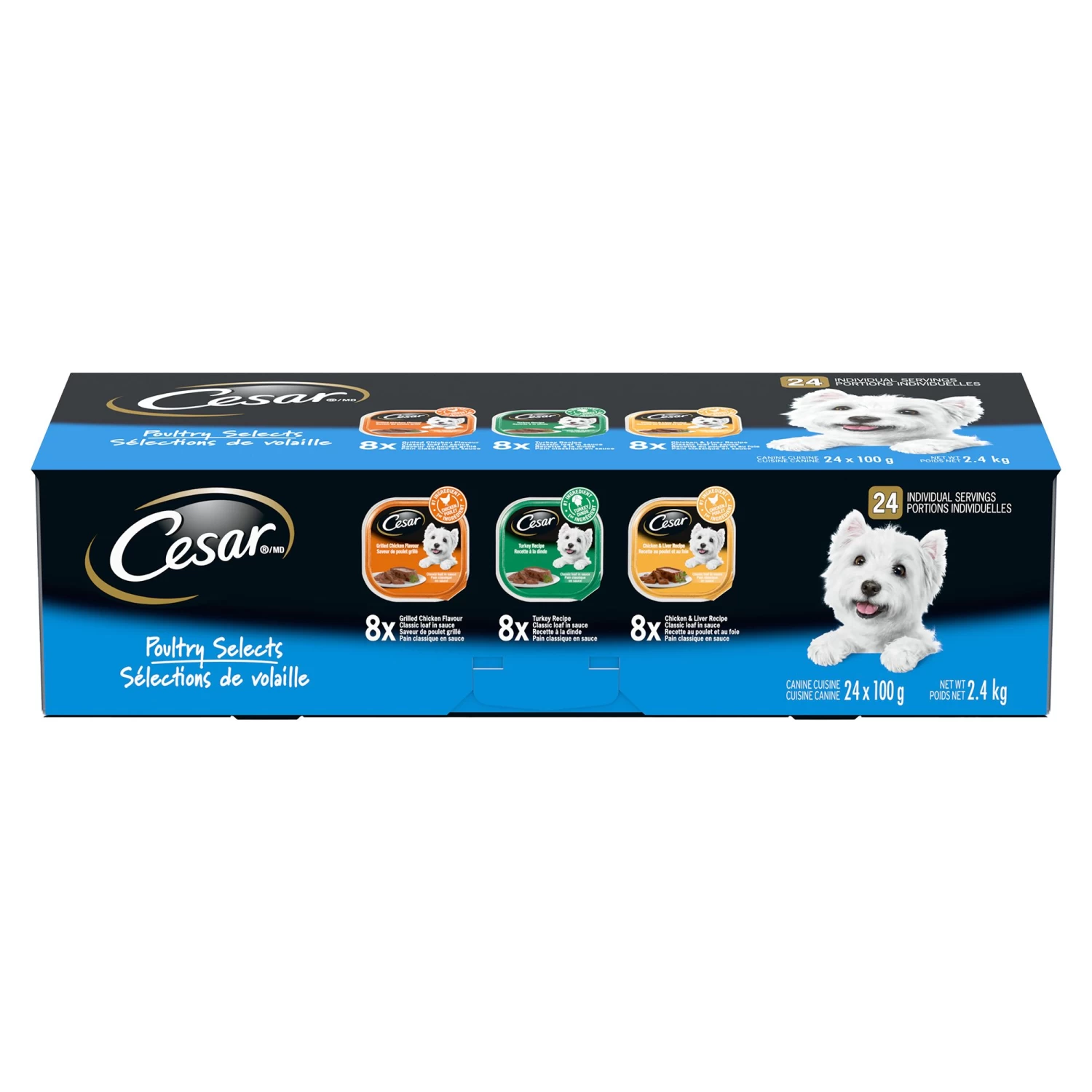 This CESAR Wet Dog Food Classic Loaf in Sauce Poultry Selects Variety Pack provides complete, balanced nutrition and a source of moisture that can be beneficial to small dogs. Gram-for-gram, wet foods like the CESAR brand have fewer calories than dry food. Now you can add more diversity to your small dog’s meals by picking up our convenient variety 24-pack, containing tasty Grilled Chicken Flavour, Turkey and Chicken & Liver recipes.