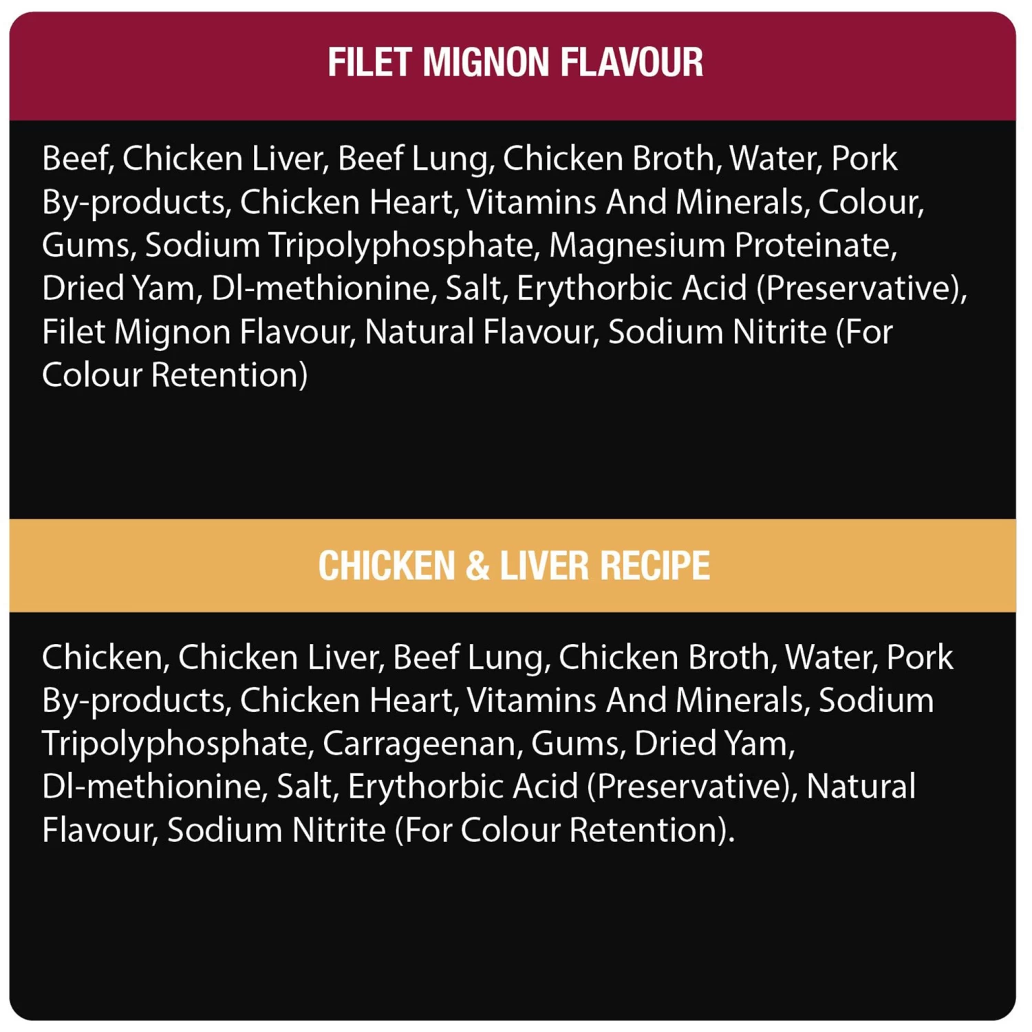 Beef, Chicken Liver, Beef Lung, Chicken Broth, Water, Pork By-Products, Chicken Heart, Vitamins and Minerals, Colour, Gums, Sodium Tripolyphosphate, , Magnesium Proteinate, Dried Yam, DL-Methionine, Salt, Erythorbic Acid (Preservative), Filet Mignon Flavour, Natural Flavour, Sodium Nitrite (For Colour Retention)