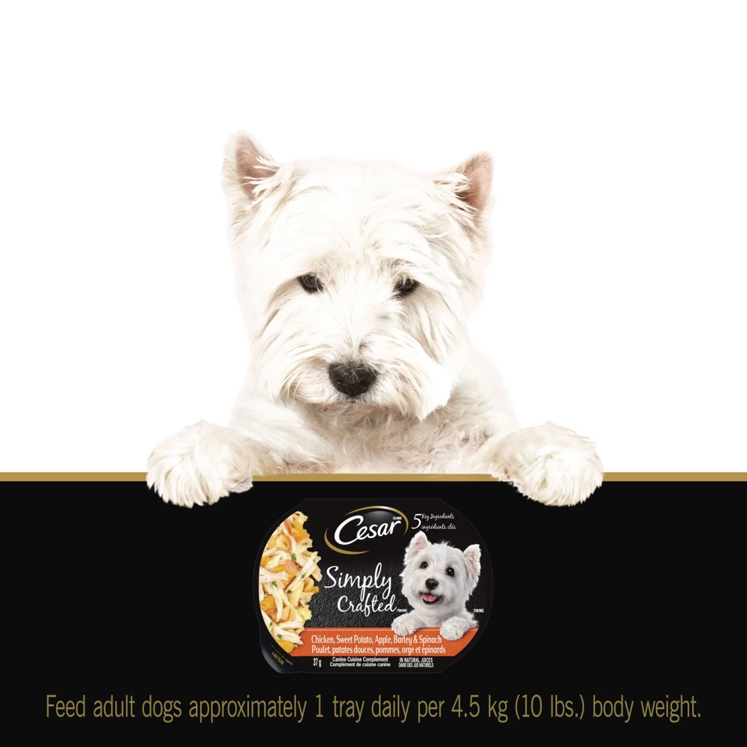 Dogs love the great taste of CESAR Wet Dog Food. CESAR SIMPLY CRAFTED Complements Tubs were designed to give dogs a simple and tasty meal complement. Add our real chicken and wholesome, quality-ingredient moist dog food recipes to any complete and balanced meal as a healthy topper. SIMPLY CRAFTED is designed with no artificial colours, flavours, fillers, or preservatives, and is always served in convenient tubs with no-fuss, easy peel freshness seals, making meal-time easy. The CESAR Brand is always looking to unlock more shared moments of joy between you and your furry friend.