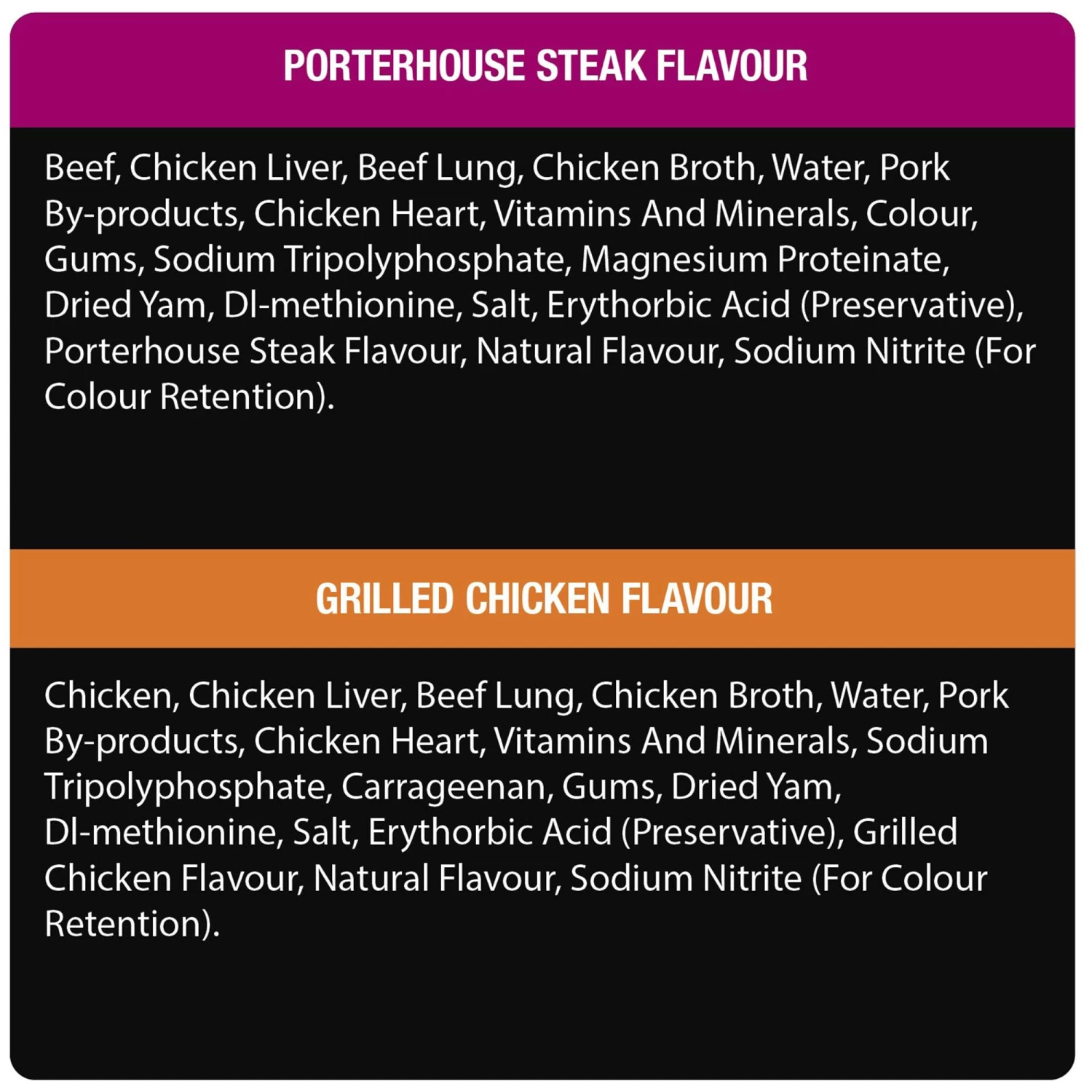 Chicken, Chicken Liver, Beef Lung, Chicken Broth, Water, Pork By-Products, Chicken Heart, Vitamins and Minerals, Sodium Tripolyphosphate, Carrageenan, Gums, Dried Yam, DL-Methionine, Salt, Erythorbic Acid (Preservative), Grilled Chicken Flavour, Natural Flavour, Sodium Nitrite (For Colour Retention).Chicken, Chicken Liver, Beef Lung, Chicken Broth, Water, Pork By-Products, Chicken Heart, Vitamins and Minerals, Gums, Sodium Tripolyphosphate, Magnesium Proteinate, Dried Yam, Colour, DL-Methionine, Salt, Erythorbic Acid (Preservative), Grilled Chicken Flavour, Natural Flavour, Sodium Nitrite (For Colour Retention)