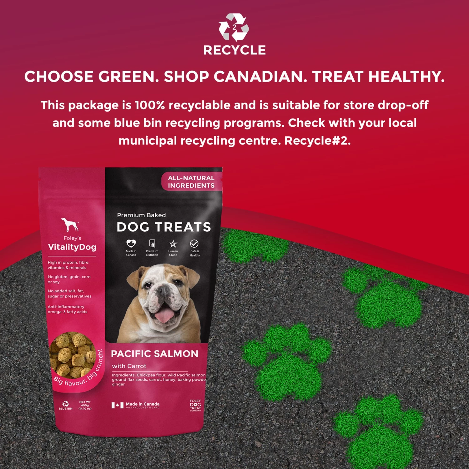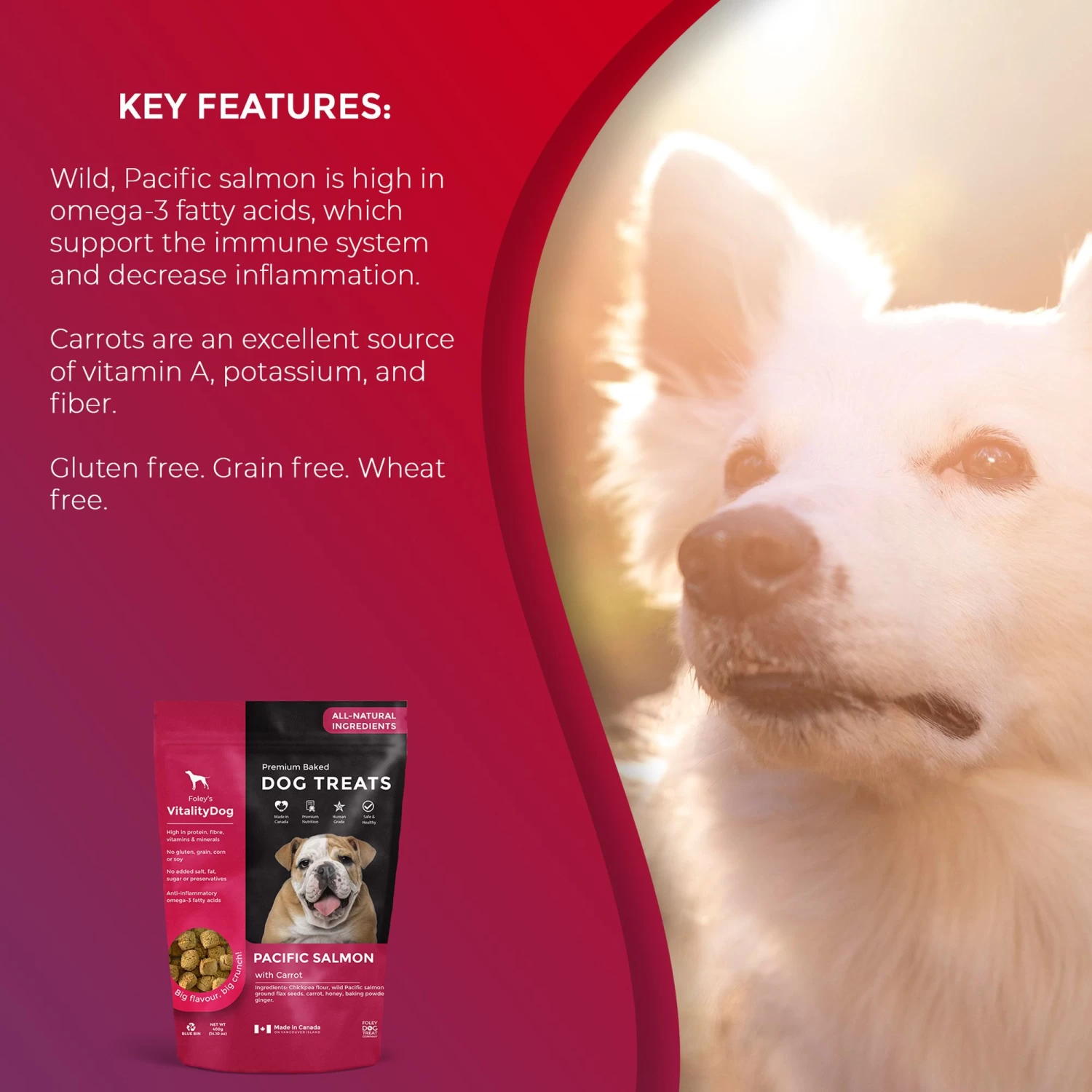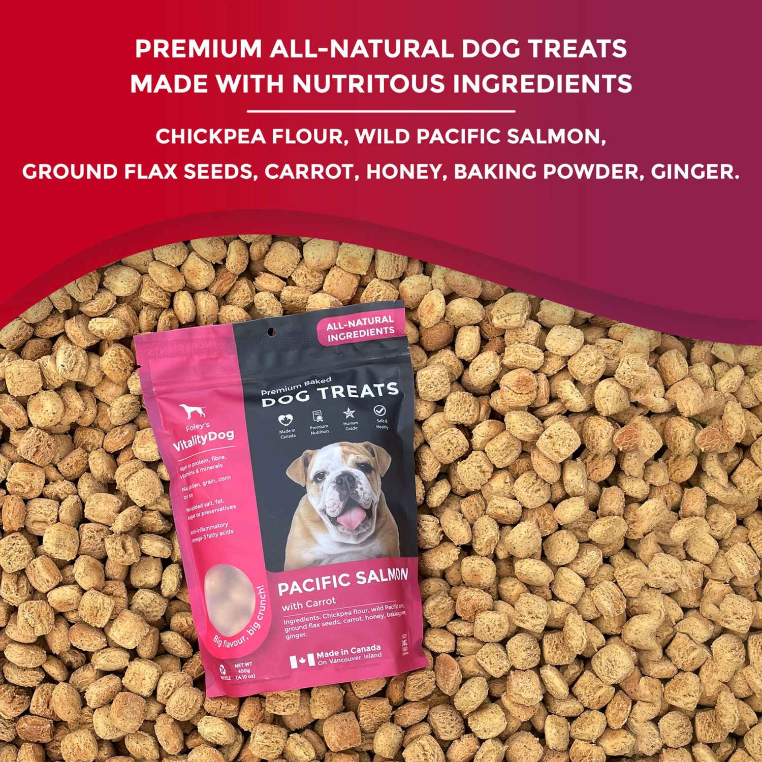 Foley’s VitalityDog pacific Salmon with Honey Carrots set a new standard in premium baked dog treats. High in protein, fibre, vitamins & minerals, they are also made using no gluten, grain, corn or soy as well as no added salt, fat, sugar or preservatives. Made in Canada on Vancouver Island, these delicious baked treats feature anti-inflammatory omega-3 fatty acids.