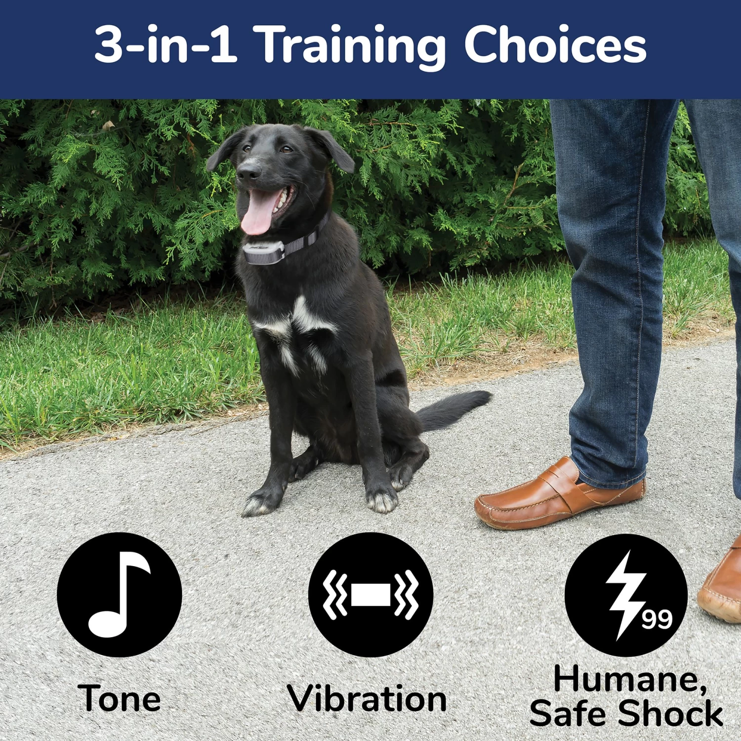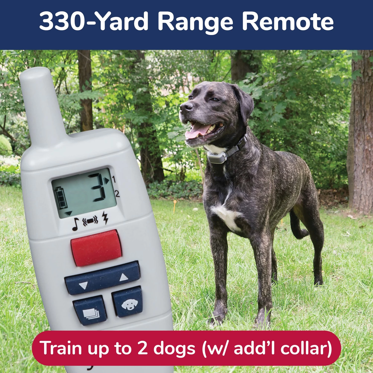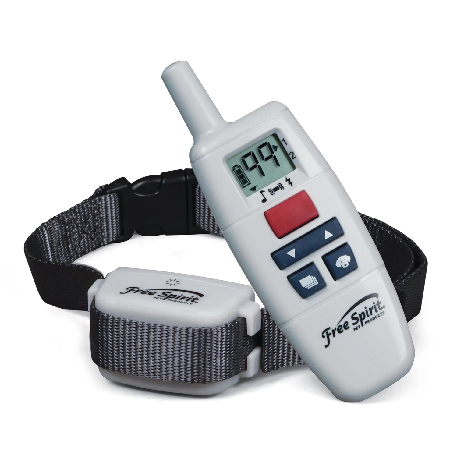 The Free Spirit Remote Trainer can be used to both stop bad behaviors and teach your dog good behaviors. The trainer has tone/beep, vibration and 99 levels of shock. The easy-to-use design only requires a press of the button and a signal is sent to the collar. A second Free Spirit Add-A-Dog collar can be added to the same remote (extra collar sold separately) for a 2-dog trainer. The simple remote and collar are also waterproof and rechargeable.