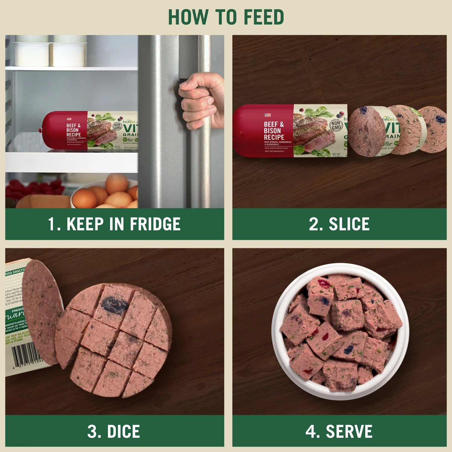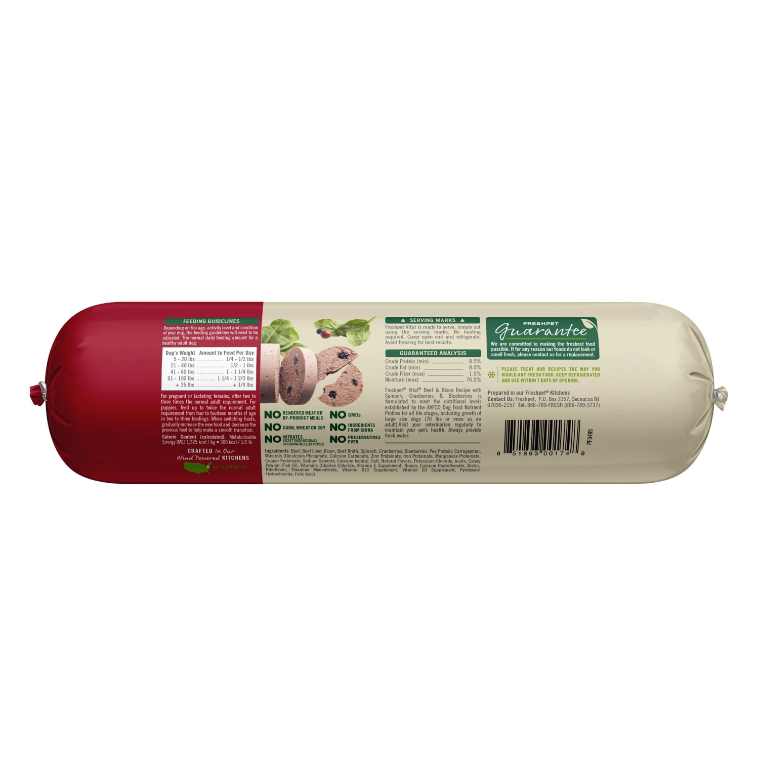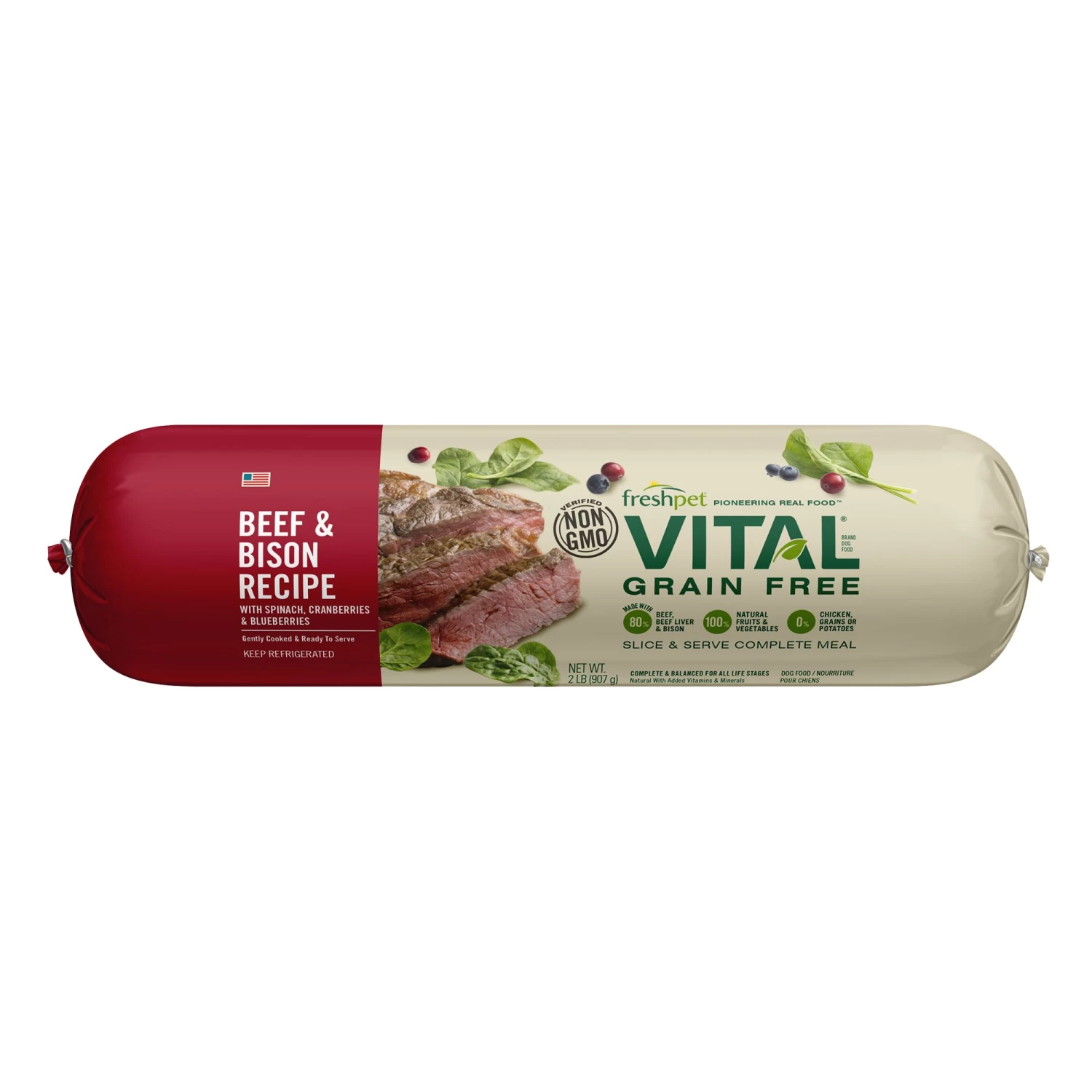 Freshpet Vital Grain-Free Beef & Bison Fresh Dog Food is a high protein, grain free roll that is gently cooked with natural beef and bison plus antioxidant-rich spinach, blueberries and cranberries. This roll is also verified Non GMO.