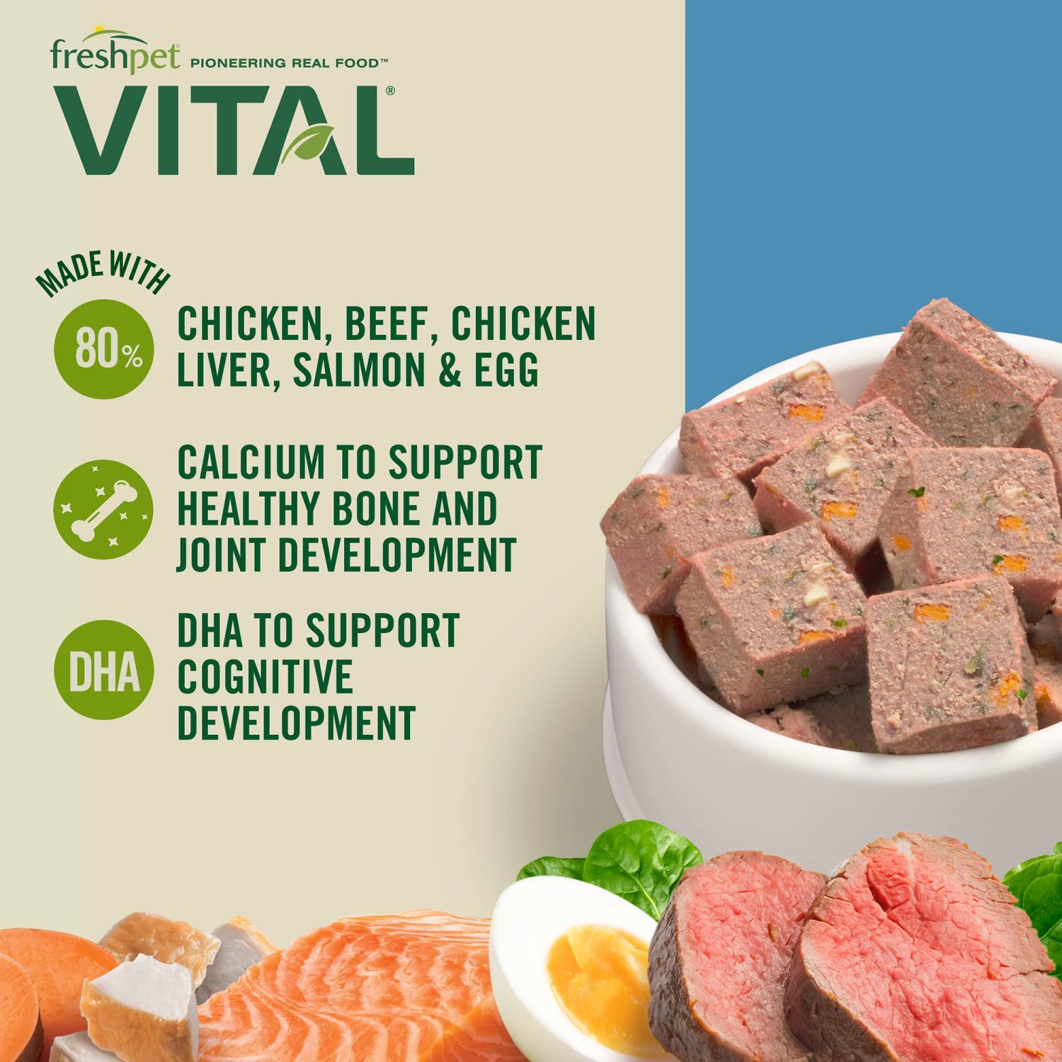 Freshpet Vital Grain Free Chicken, Beef, Salmon & Egg Fresh Puppy Food is a high protein, grain free puppy roll that is gently cooked with a mix of natural chicken, beef, salmon, and egg plus antioxidant-rich spinach and sweet potatoes. This roll is specifically crafted with calcium for bone and joint growth, DHA to support brain development, and omega 6 & 3 for healthy skin and coat. Verified Non GMO.