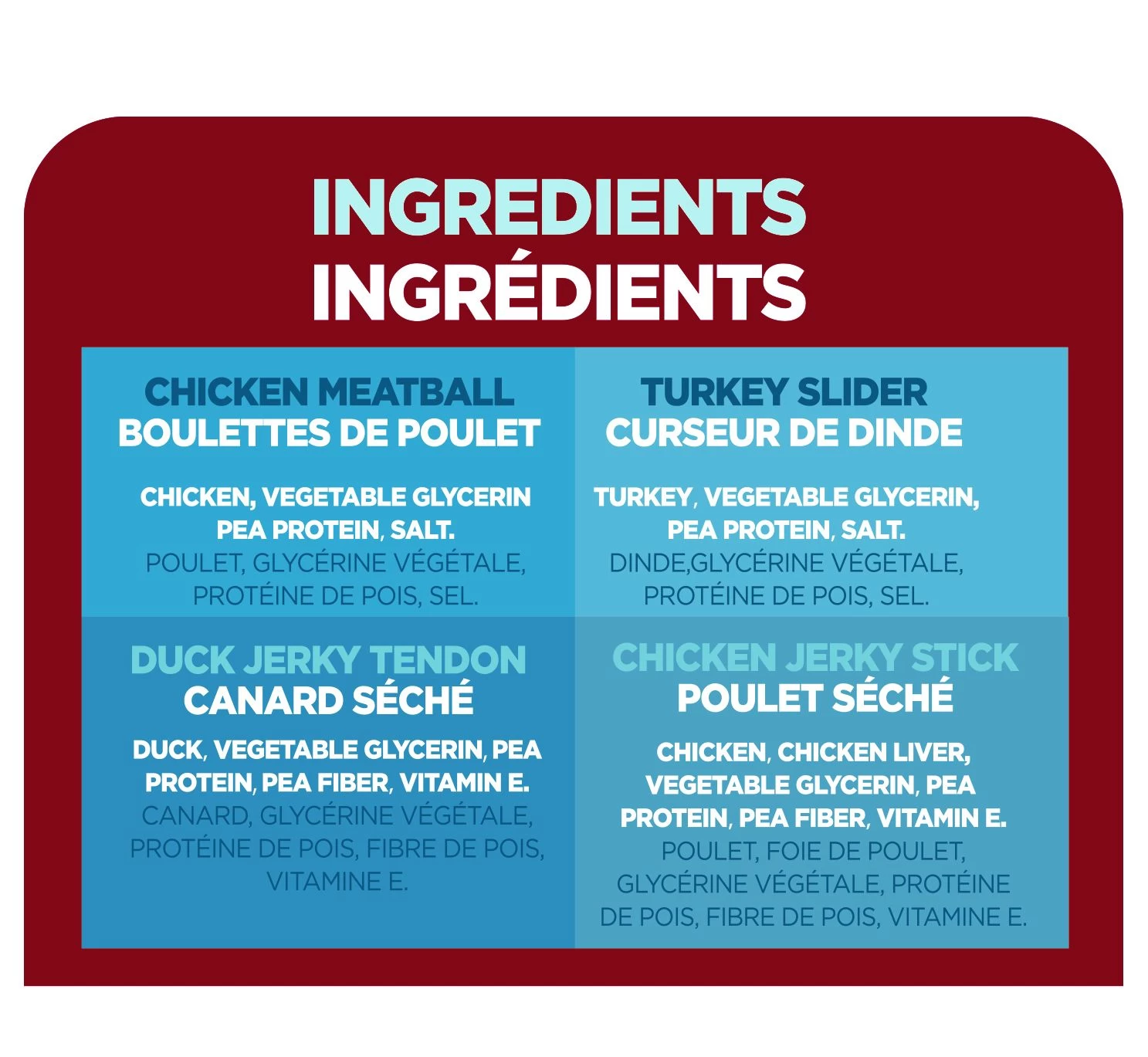 Chicken, Vegetable Glycerin, Pea Protein, Salt.