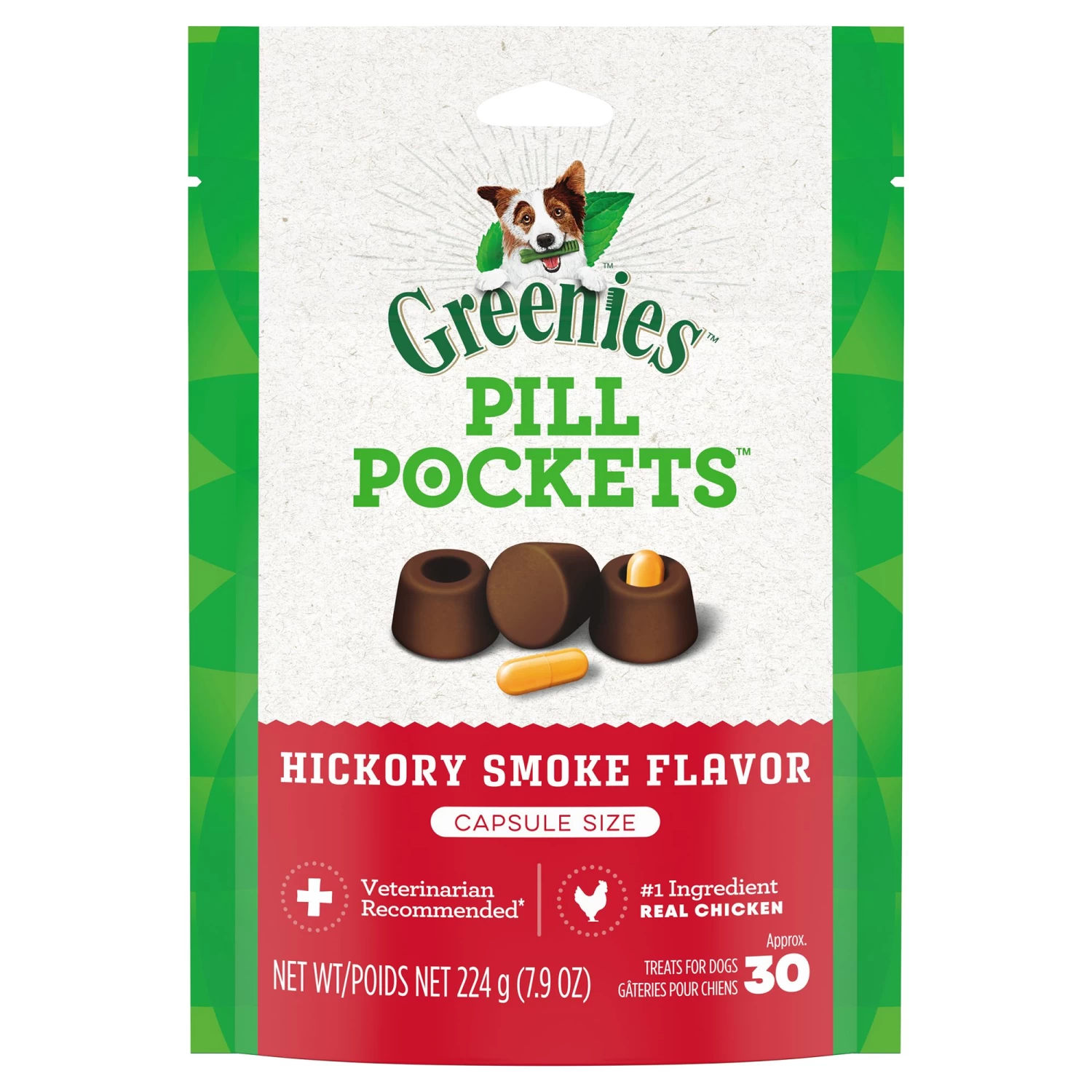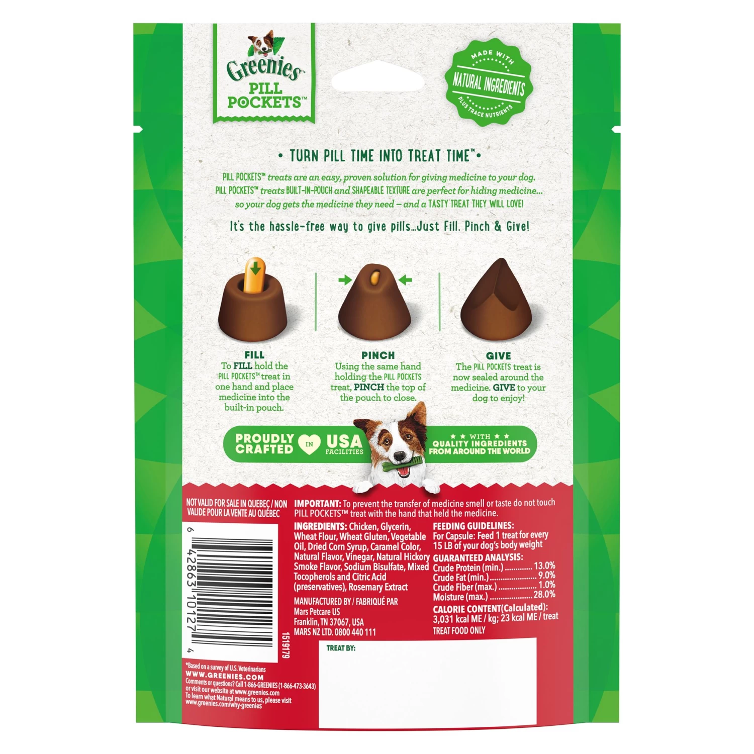 PILL POCKETS TURN PILL TIME INTO TREAT TIME. GREENIES Pill Pockets Treats for Dogs make it easy to give your dog medicine, with a tasty hickory smoke flavor they’re sure to love. Why hide your pet’s medicine in human foods like peanut butter or cheese when you can give them a healthy all natural dog treat, made with natural, real ingredients plus trace nutrients instead? Designed by veterinarians, GREENIES Pill Pockets Dog Treats mask the smell and taste of any medicine, taking the stress (and mess) out of giving your canine companion medicine. Whether for large breed or small dogs, these smaller-sized Pill Pockets for capsules make taking medicine a positive experience for your dog. And they’re easy to give: Simply drop a capsule into the Pill Pockets pouch, pinch the top half closed, give it to your pup, and poof: Watch their medicine disappear. GREENIES Pill Pockets are the ingenious way to give your dog their meds – and they’ll never know the difference. * Data on file at Mars Petcare US, Inc. 2018