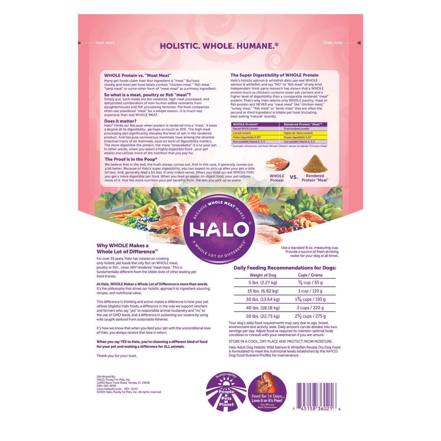 Halo uses WHOLE meat, never any “meat meal” of ANY kind in our natural dog food. Halo dog food is now made with Dream Coat Skin and Coat Care from non-GMO plant sources and Vitamin E to support healthy skin and shiny coat. We also have dog food options for special diets, including puppy food, small breed dog food, vegan dog food, senior dog food, and grain free dog food. At Halo, WHOLE Makes a Whole Lot of Difference is the philosophy that drives our holistic approach to ingredient sourcing, recipes, nutritional value, the welfare of ALL animals, and our overall mission to change the way companion animals are fed and farm animals are raised for the better!