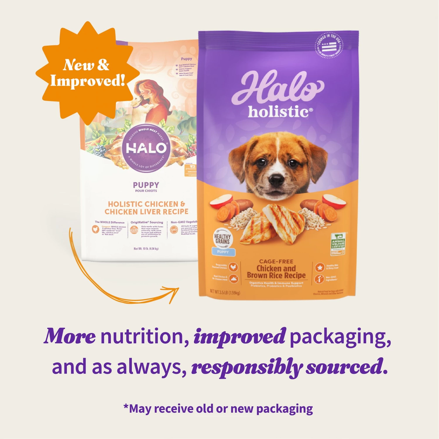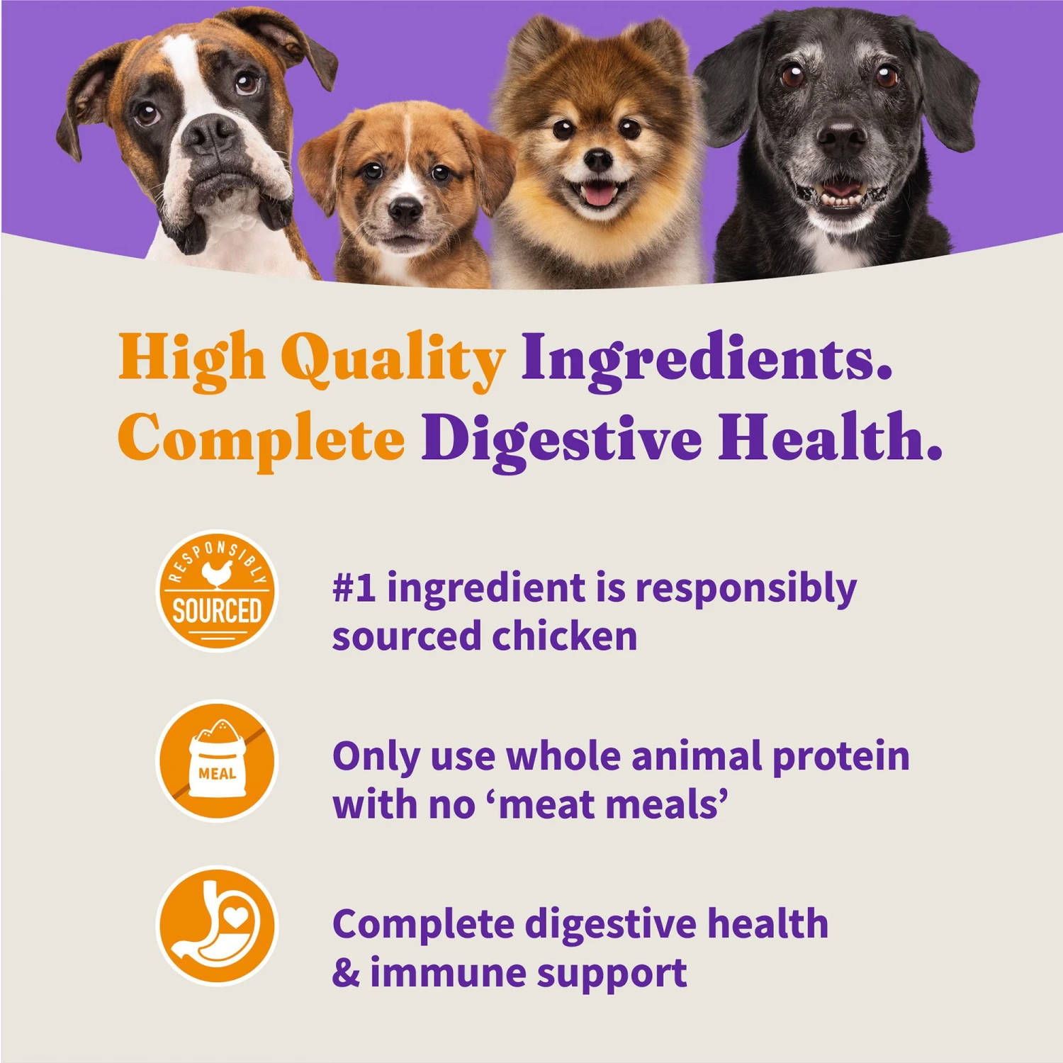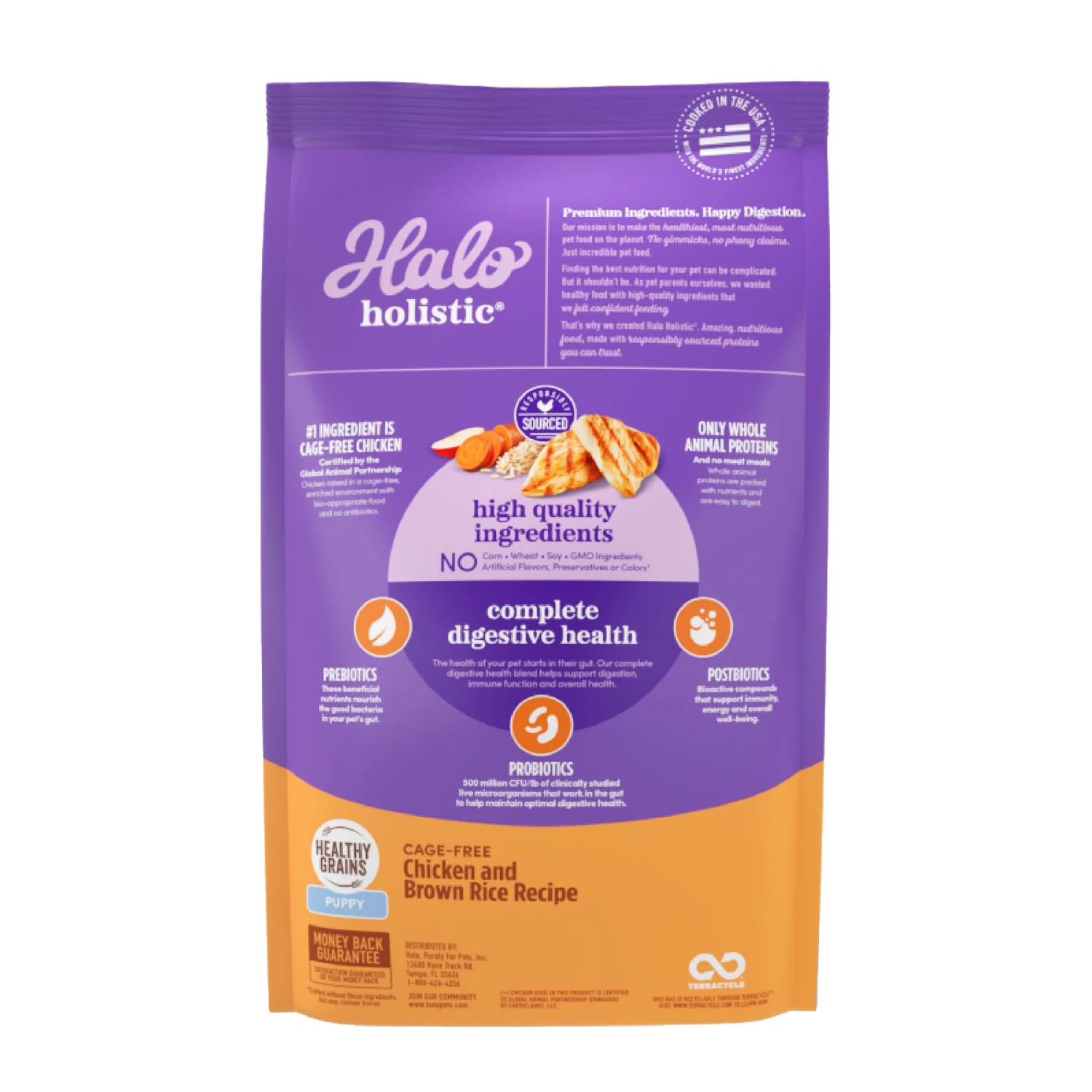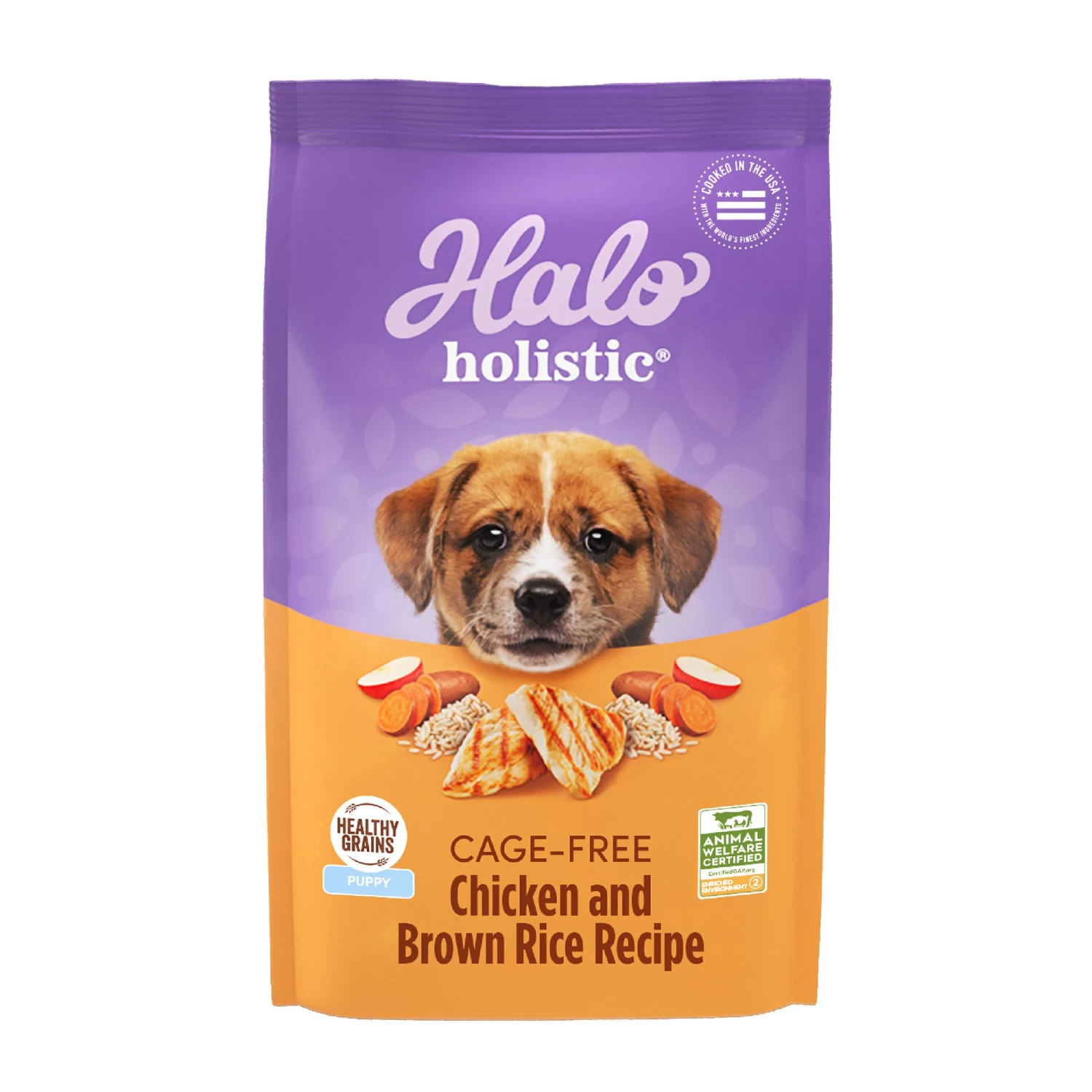 Boost your dog’s digestive health with Halo Holistic Cage-free Chicken and Brown Rice Recipe, a dry dog food formulated with high-quality ingredients for digestive health. Your pet’s health starts in their gut, and our holistic dog food is made with high-quality ingredients that optimize their overall well-being. We start with real, cage-free, certified chicken as the first ingredient. Our super premium dog food uses only real, whole meat, poultry or fish, and no meat meal at all, for a rich flavor that your pet will love. Plus, as a digestive dog food, it includes prebiotics and probiotics for dogs, plus postbiotics to support every stage of digestion. Our natural dog food dry formula has added vitamins, minerals, and nutrients. Each recipe supports healthy skin and coat for dogs with no corn, wheat or soy or artificial preservatives. No gimmicks, no phony claims. Just incredible pet food. That’s Halo Holistic chicken and rice dog food.