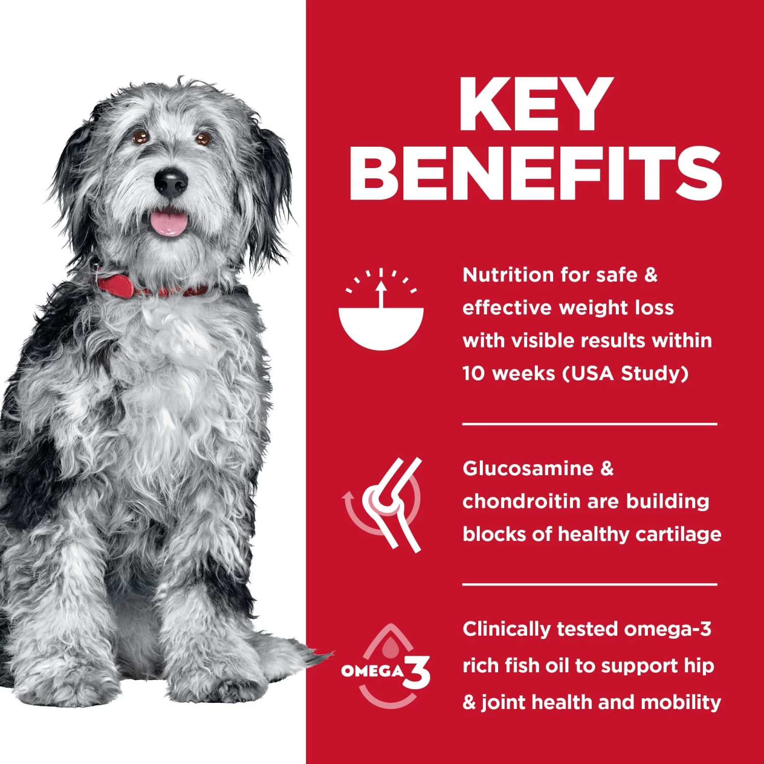 This weight management and mobility support dog food was created with Hill’s unique understanding of the biology of overweight dogs. It provides lean muscle support, and also uses clinically proven antioxidants for a healthy immune system. Over 70% of dogs lost weight within 10 weeks. With added fish oil to provide EPA, an Omega-3, to help support joint function for a mobile & active life. Feed this breakthrough nutrition for your dog’s healthy joints & weight maintenance.