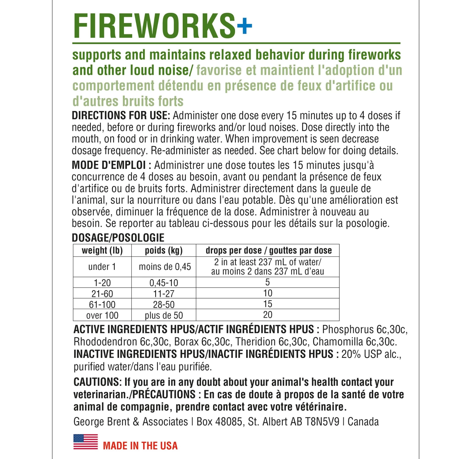 DOGS/CATS: Under 20 lbs/10 kg, 5 drops; 21-60 lbs/ 10-30 kg, 10 drops; 61-100 lbs/ 30-45 kg, 15 drops; over 100 lbs/45 kg, 20 drops. In acute cases, the doses can be given every 15 minutes, up to 4 doses. For cases that are not acute, one dose 3 times daily; this is often best started 5-7 days before any situation causing anxious behavior, e.g. before kenneling. Once a response is seen, administration should be reduced to 2 times daily and eventually once daily. When symptoms clear up, discontinue use. If reduction causes symptoms to worsen, original dosing may be continued a little longer before reducing. If a remedy is working well and dosing is not reduced, an aggravation of symptoms from overuse may occur. Stopping the remedy for 3 days will reverse the symptoms, and then treatment can begin as if using for the first time, weaning down as mentioned above.