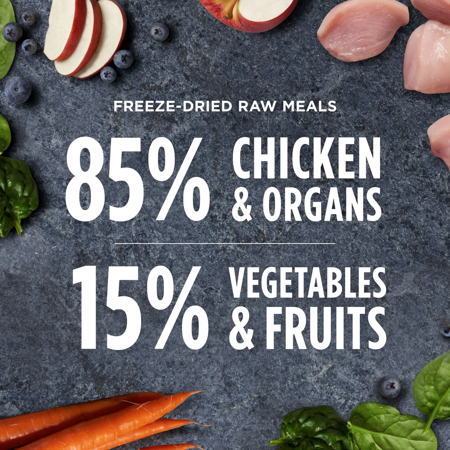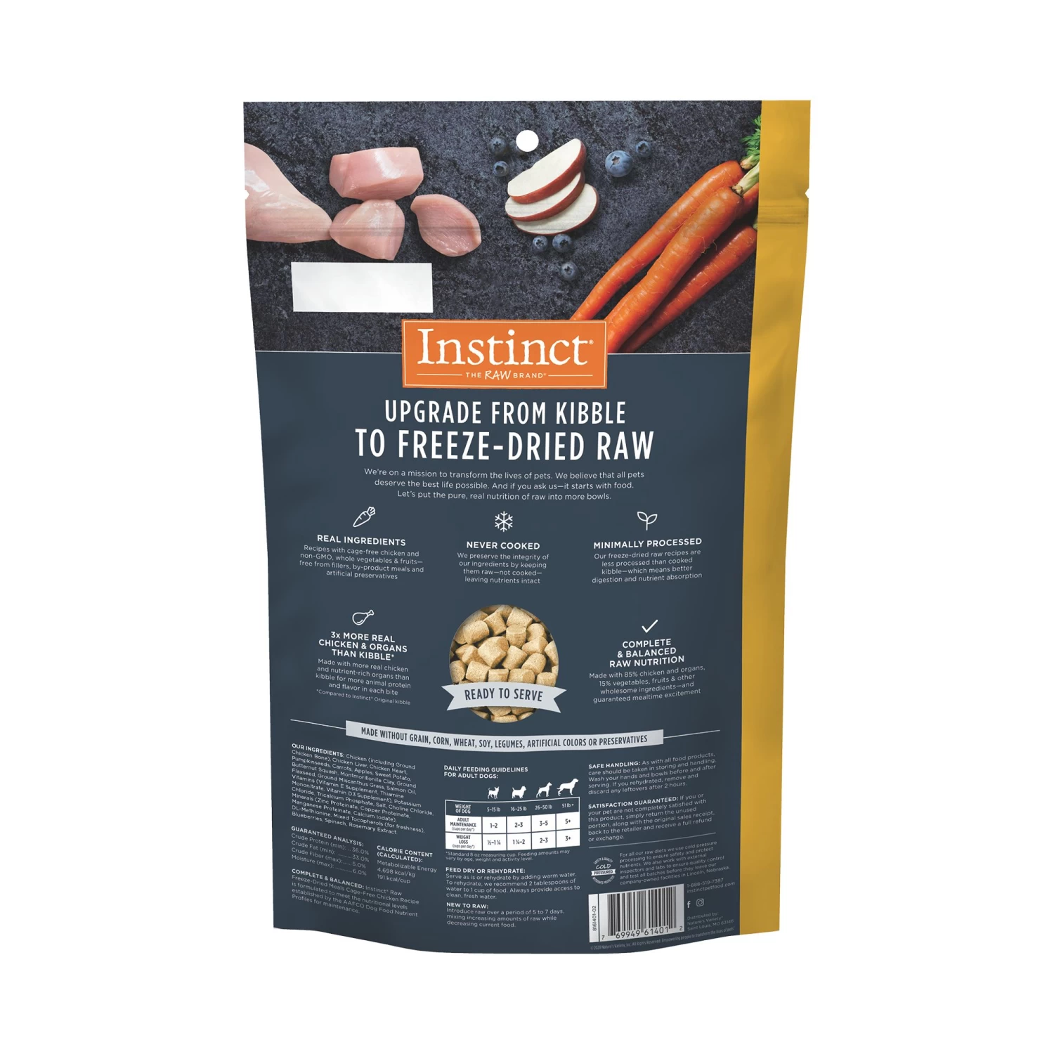 Upgrade your dog’s bowl from kibble to freeze-dried raw. Each Instinct Raw Freeze-Dried Meals recipe is protein packed with 85% meat & organs and 15% non-GMO fruits, vegetables; vitamins & minerals. Made without grain, corn, wheat, soy, legumes, artificial colors or preservatives. Available Varieties: Real beef, cage-free chicken, grass-fed lamb, wild-caught alaskan pollock. Varieties: Puppy. Instinct Raw Freeze-Dried Meal Cage-Free Chicken Recipe is formulated to meet the nutritional levels established by the AAFCO Dog Food Nutrient Profiles for maintenance. All Instinct products are 100% Satisfaction Guaranteed. If you or your pet are not completely satisfied with this or any Instinct product, simply return the unused portion, along with the original sales receipt, to the retailer for a complete refund or replacement.