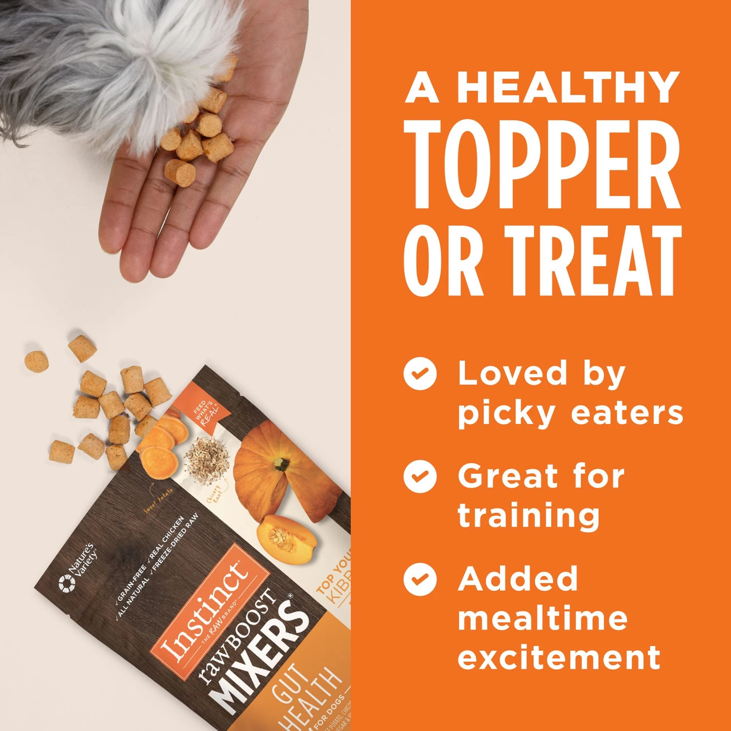 Top your dog’s kibble with raw. Instinct Raw Boost Mixers Gut Health provides fiber and live, natural probiotics to help maintain digestive health. Our recipes combine cage-free chicken plus vibrant, functional, whole-food ingredients – 100% freeze-dried and bursting with flavor and nutrition. Available Varieties: Gut Health, Skin & Coat Health, Mobility Support, Immune Health, Multivitamin, Calming Support, Healthy Energy. Instinct Raw Boost Mixers Gut Health Recipe is intended for intermittent or supplemental feeding only. This is a complementary food and should be fed along with a complete and balanced diet. All Instinct products are 100% Satisfaction Guaranteed. If you or your pet are not completely satisfied with this or any Instinct product, simply return the unused portion, along with the original sales receipt, to the retailer for a complete refund or replacement.