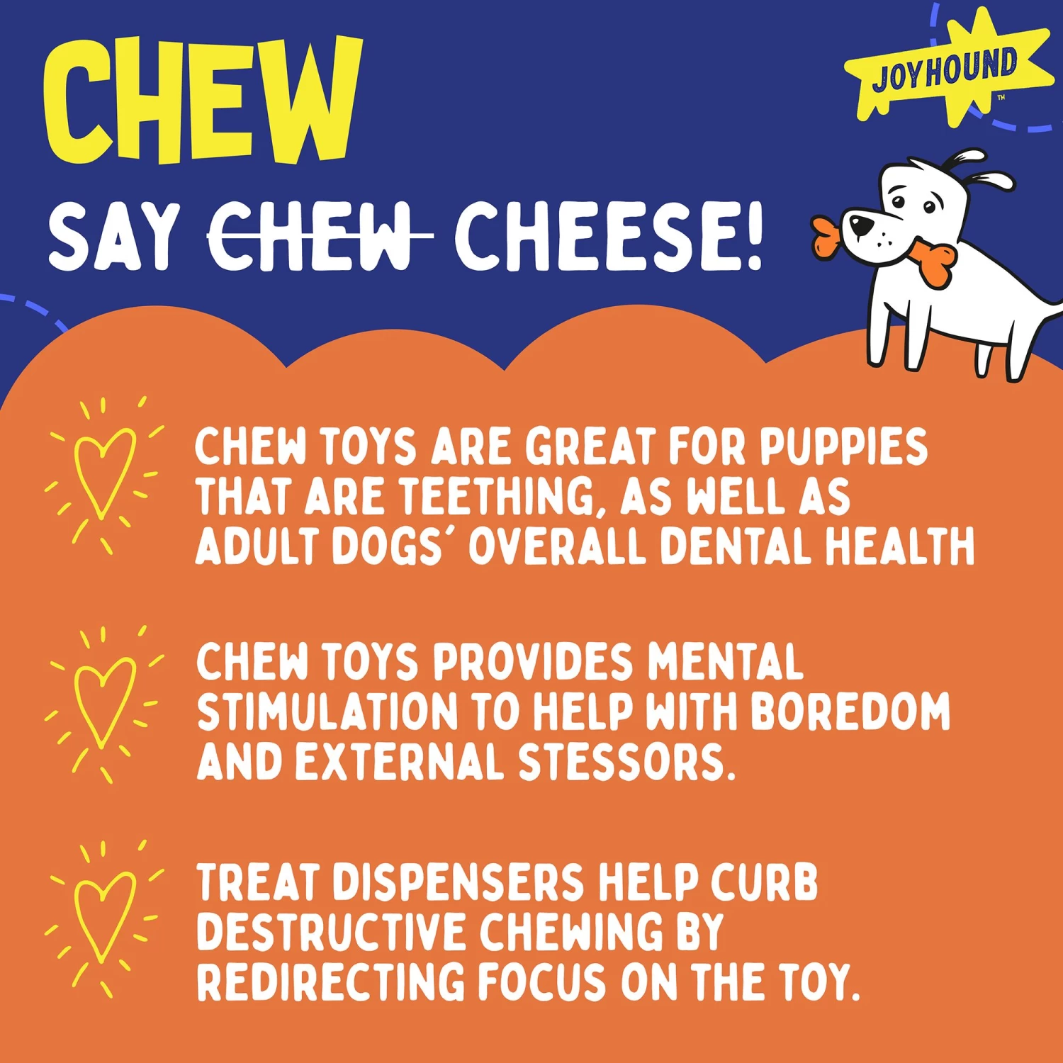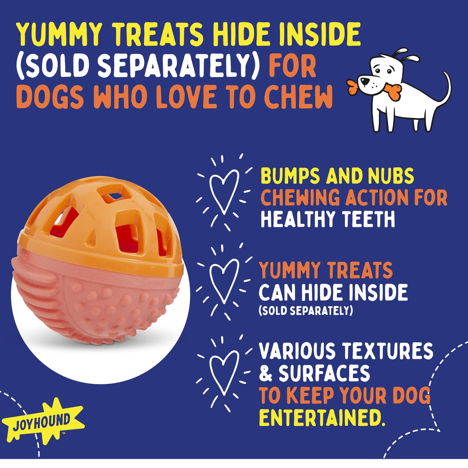 Our Joyhound Ball Treat Dispenser provides an interactive treat dispensing activity for your dog. Dogs love chew toys and dog treats unconditionally, and our special treat dispenser gives your pet access to both in one engaging toy. Regular use helps tame their chewing activity by focusing it in a healthier way. This durable dispenser toy also works to clean teeth as your pup happily chews the day away. Only at PetSmart.