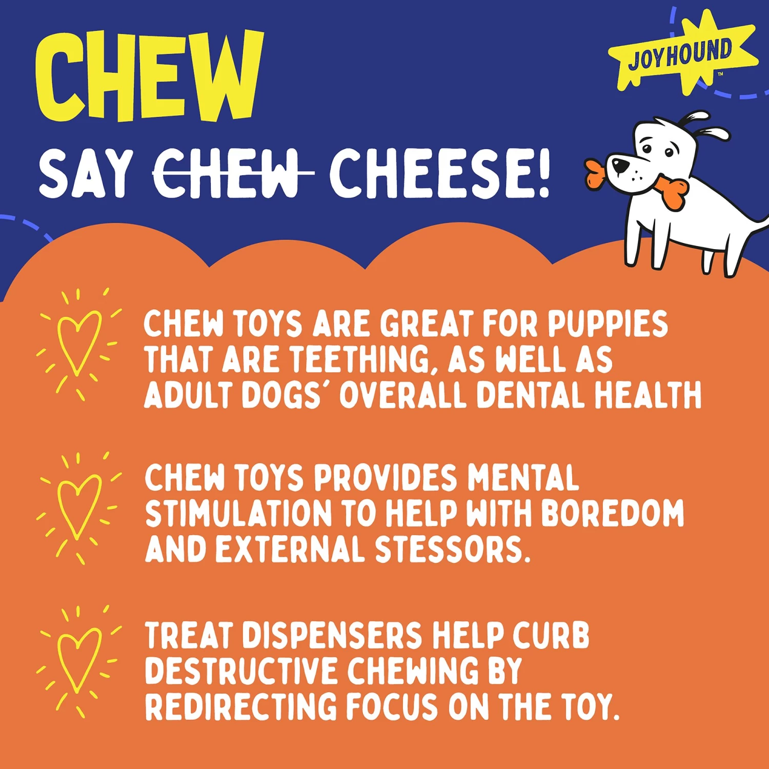 Our Joyhound Stick Treat Dispenser provides an interactive treat dispensing activity for your dog. Dogs love chew toys and dog treats unconditionally, and our special treat dispenser gives your pet access to both in one engaging toy. Regular use helps tame their chewing activity by focusing it in a healthier way. This durable dispenser toy also works to clean teeth as your pup happily chews the day away. Only at PetSmart.
