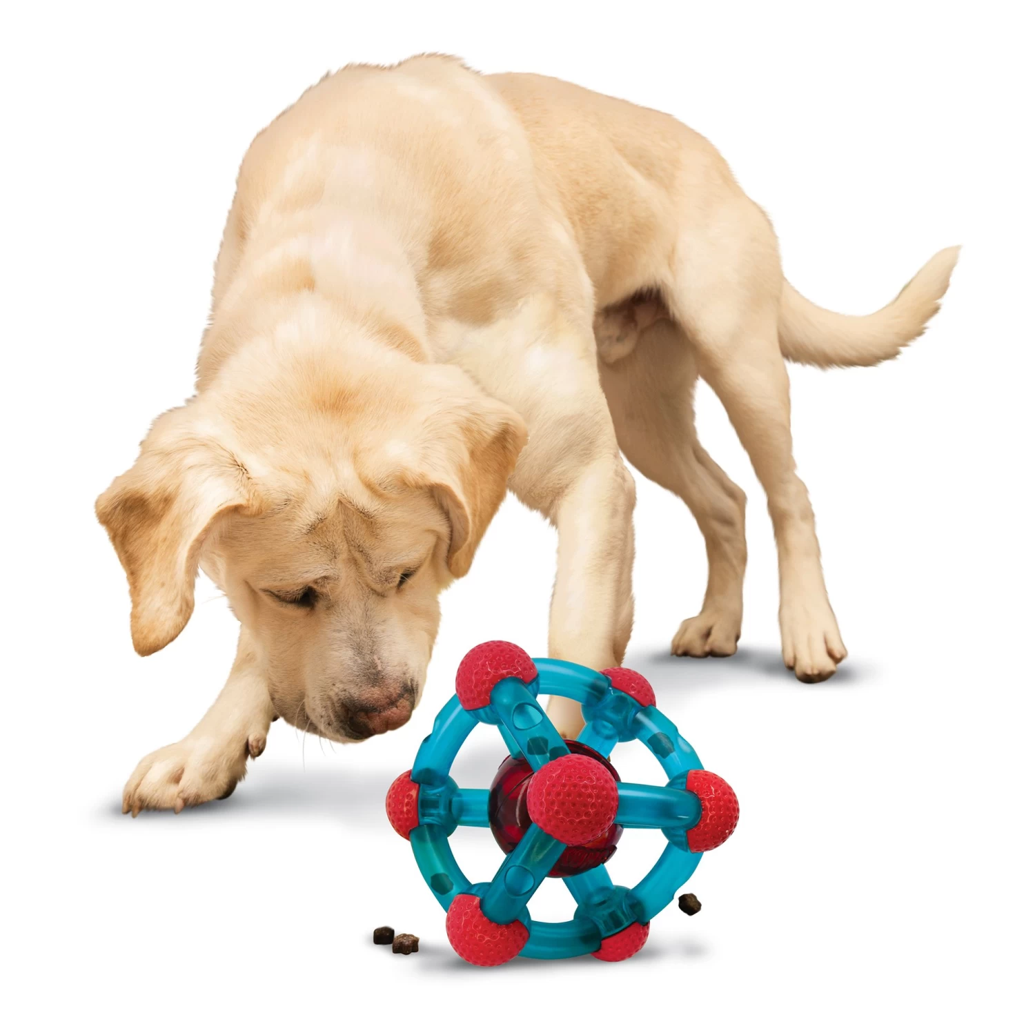 The KONG Rewards Tinker randomly dispenses treats through holes in 6 different spots, increasing the irresistible unpredictability that keeps dogs riveted. Tinkering around with the toy moves kibbles through the tubes, releasing them as it rolls and bounces. Funnel makes it easy to fill with 1 cup of food for a mentally stimulating feast. Use for meals to help manage weight. Corners mute play for quieter action.