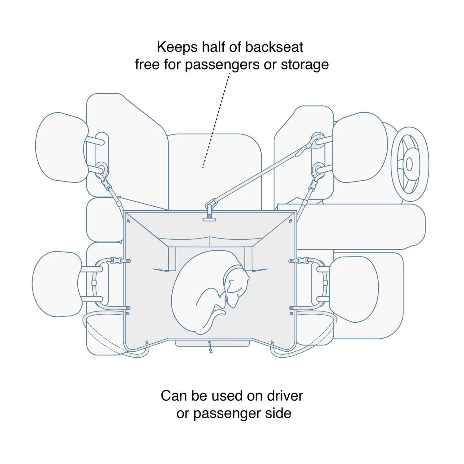 The Heather Half Hammock turns half your backseat into a cozy, secure space for your dog, while leaving the other half free for human guests. The waterproof, stain-resistant 600D polyester fabric keeps your seats protected, and the gusseted flaps allow easy access to seatbelts. It attaches to all four of your vehicle’s headrests, and, an additional five points of adjustment provide extra security.