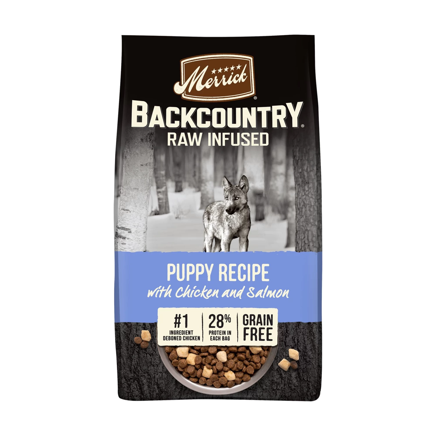 Connect your puppy to an ancestral diet with Merrick Backcountry Raw Infused Grain Free Puppy Food Recipe, Freeze Dried Dog Food. This dog dry food combines freeze-dried raw-coated kibble and freeze-dried raw dog food bites to offer puppies the benefits of a high protein dog food and a raw diet. The first ingredient in this real meat dog food is deboned chicken, for a protein-rich, grain free puppy food. Salmon is blended into this natural dog food, for a highly digestible, healthy dog food. This Merrick Backcountry dog food grain free recipe provides dogs with the protein they crave, plus the nutrients they need from a dry puppy food. High levels of omega fatty acids in this grain free dry dog food maintain healthy skin and coat, and glucosamine and chondroitin support healthy hips and joints. Return your puppy to the diet nature intended with freeze-dried raw protein from this Backcountry dog food. Merrick dog food is crafted in our Hereford, TX kitchen.
