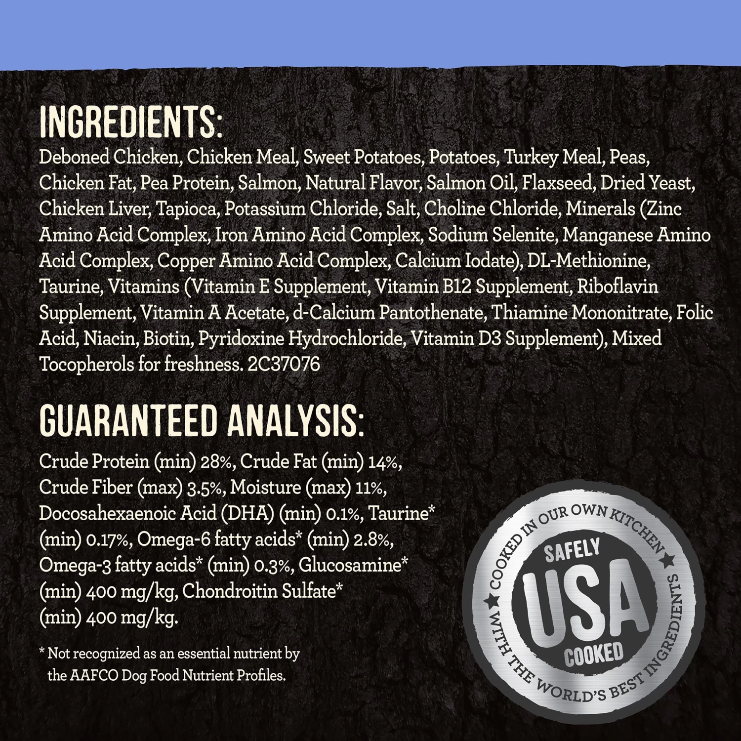 Deboned Chicken, Chicken Meal, Sweet Potatoes, Potatoes, Turkey Meal, Peas, Chicken Fat, Potato Protein, Salmon, Natural Flavor, Tapioca, Flaxseed, Salmon Oil, Sunflower Oil, Chicken Liver, Potassium Chloride, Salt, Organic Dehydrated Alfalfa Meal, Choline Chloride, Apples, Blueberries, Minerals (Iron Amino Acid Complex, Zinc Amino Acid Complex, Zinc Sulfate, Sodium Selenite, Manganese Amino Acid Complex, Copper Amino Acid Complex, Copper Sulfate, Potassium Iodide, Cobalt Proteinate, Cobalt Carbonate), Taurine, Yucca Schidigera Extract, Mixed Tocopherols for freshness, Vitamins (Vitamin E Supplement, Vitamin B12 Supplement, Riboflavin Supplement, Vitamin A Acetate, d-Calcium Pantothenate, Thiamine Mononitrate, Folic Acid, Niacin, Biotin, Pyridoxine Hydrochloride, Vitamin D3 Supplement), Citric Acid for freshness, Dried Lactobacillus plantarum Fermentation Product, Dried Lactobacillus casei Fermentation Product, Dried Enterococcus faecium Fermentation Product, Dried Lactobacillus acidophilus Fermentation Product