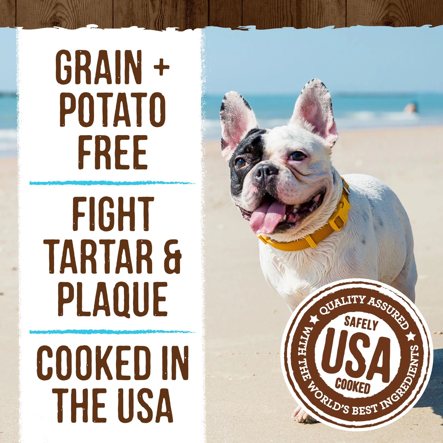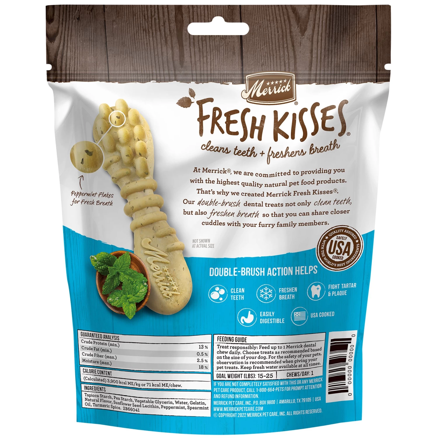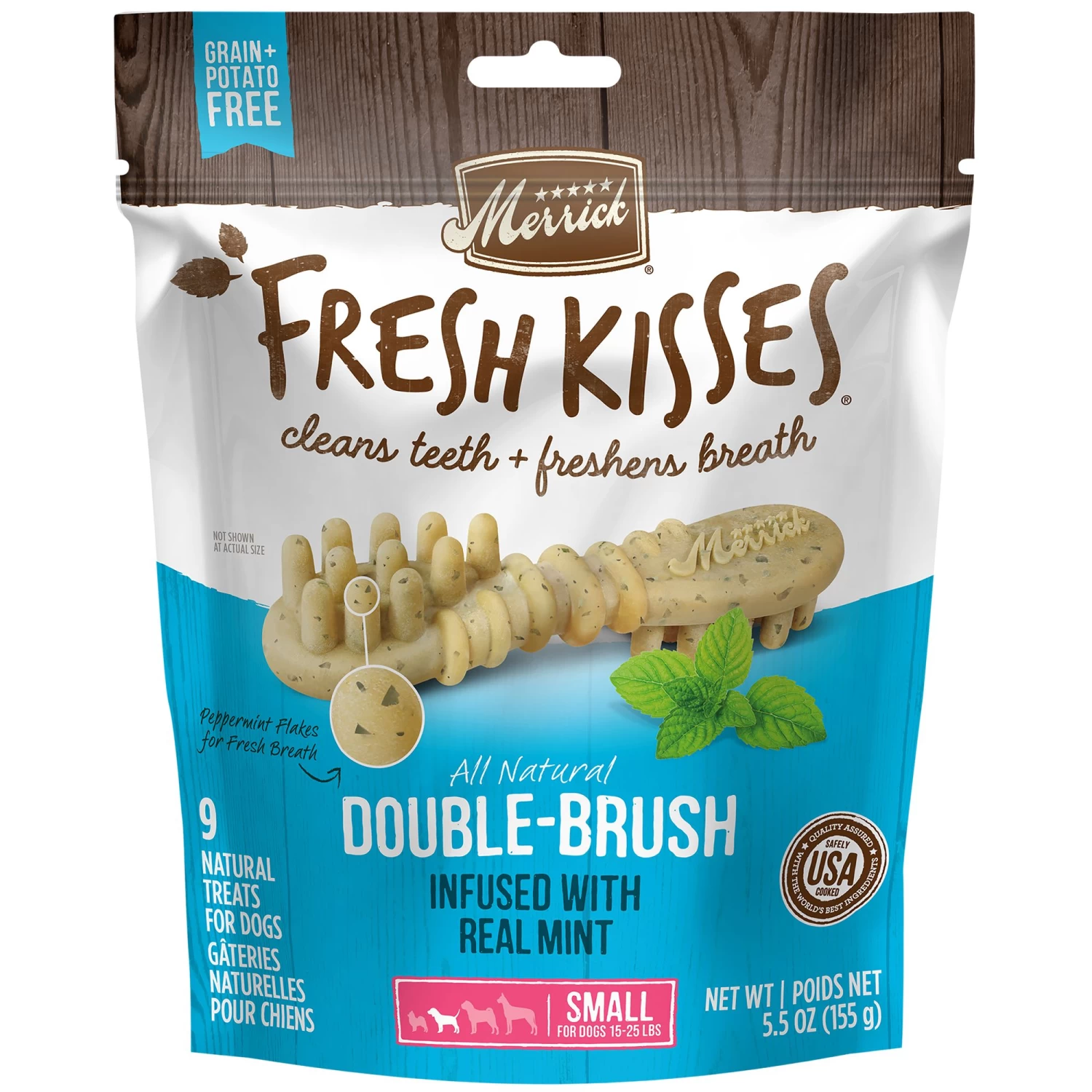 Sniff out the secret to fresh doggy breath and dog dental care with Merrick Fresh Kisses With Mint Breath Strips, Dental Dog Treats for Small Breed Dogs. Fresh Kisses natural dog treats deliver two big benefits: cleaner teeth and truly fresh breath. These dental dog chews are soft enough to effectively clean plaque and tartar from your dog’s teeth as they chew, yet tough enough to last while they enjoy a happy chewing session. Crafted specially for small breed dogs weighing 15 to 25 pounds, every Fresh Kisses dog breath treat is made with all-natural spearmint-flavored breath strip pieces to freshen your dog’s breath as they chew. With no grains, gluten or potatoes, Fresh Kisses dental treats are only made with natural ingredients for small dog chews that are easy to digest. Fresh Kisses cleans teeth and freshens breath for dogs using only 10 of the world’s best all-natural ingredients.