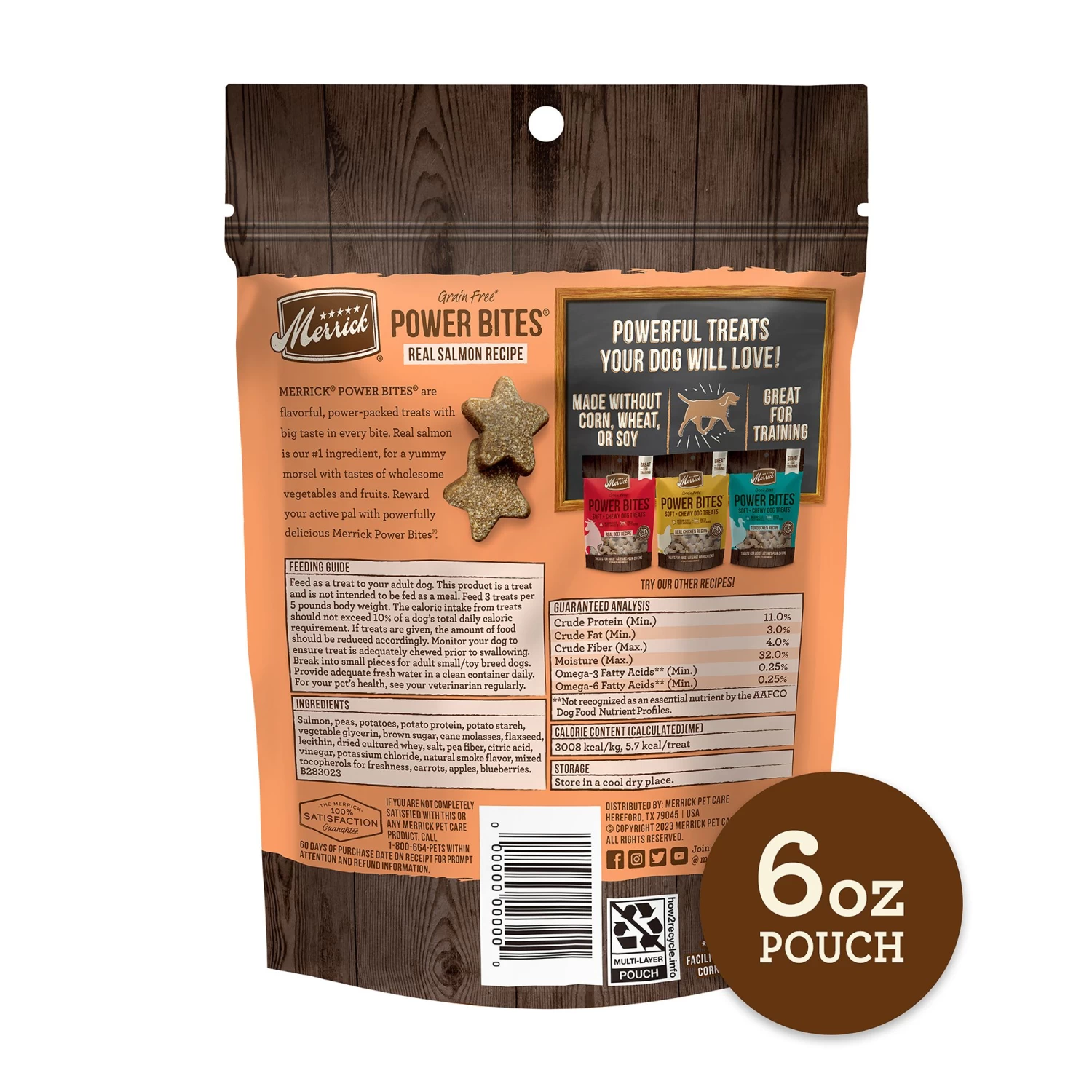 Excite your dog with every bite of Merrick Power Bites Soft Dog treats, Real Salmon Dog Treats Recipe. These real meat dog treats provide real salmon as the first ingredient for soft chewy dog treats. Merrick dog treats feature delicious flavors and nutrients like omega fatty acids, making them ideal dog snacks for training or rewarding your dog. These premium and natural soft treats with added minerals are made without corn, soy, or wheat. Power Bites grain free dog treats are wholesome treats without artificial flavors, colors, or preservatives. This resealable bag of fish treats offers the perfect training treat or snack for all breeds. These star-shaped soft dog treats can be broken into smaller bites for small dogs or fed whole for medium and large dogs. These treats are made in facilities that process corn, wheat and soy. Merrick’s dog soft treat recipes are cooked with the world’s best ingredients.