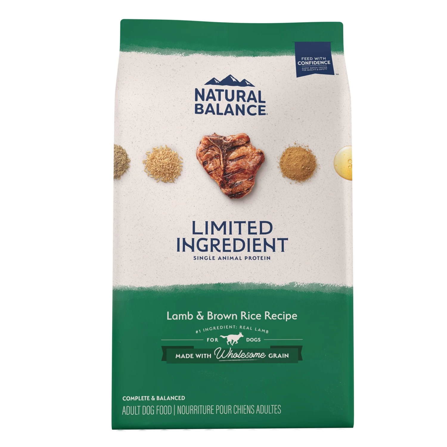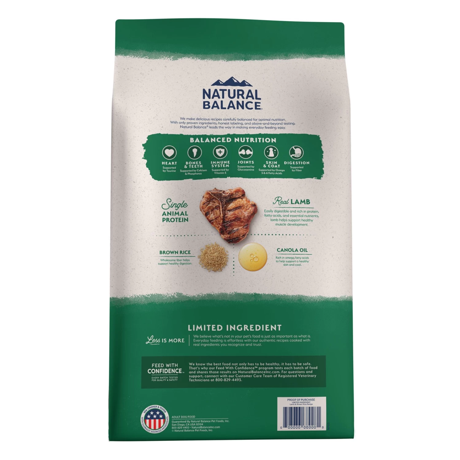 Natural Balance L.I.D. Limited Ingredient Diets Lamb & Brown Rice Formula Dry Dog Food is grain-inclusive and is made with no gluten ingredients. The first ingredient is real lamb, which provides amino acids to help build the strong muscles your dog needs to make the most of your adventures together. Meanwhile, the brown rice contains fiber to help support healthy digestion. And with essential vitamins and minerals, this delicious lamb and brown rice formula dog food is complete and balanced for adult dogs of all sizes.