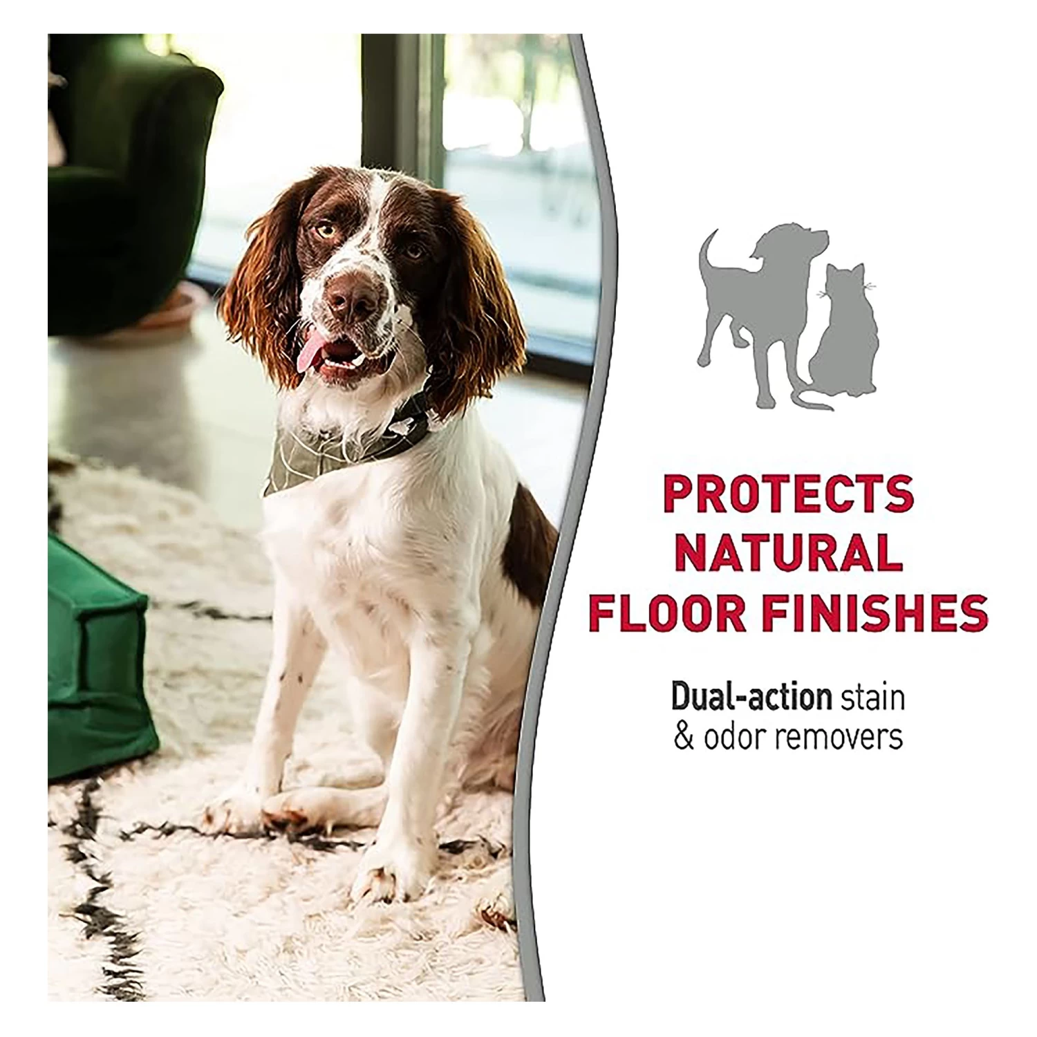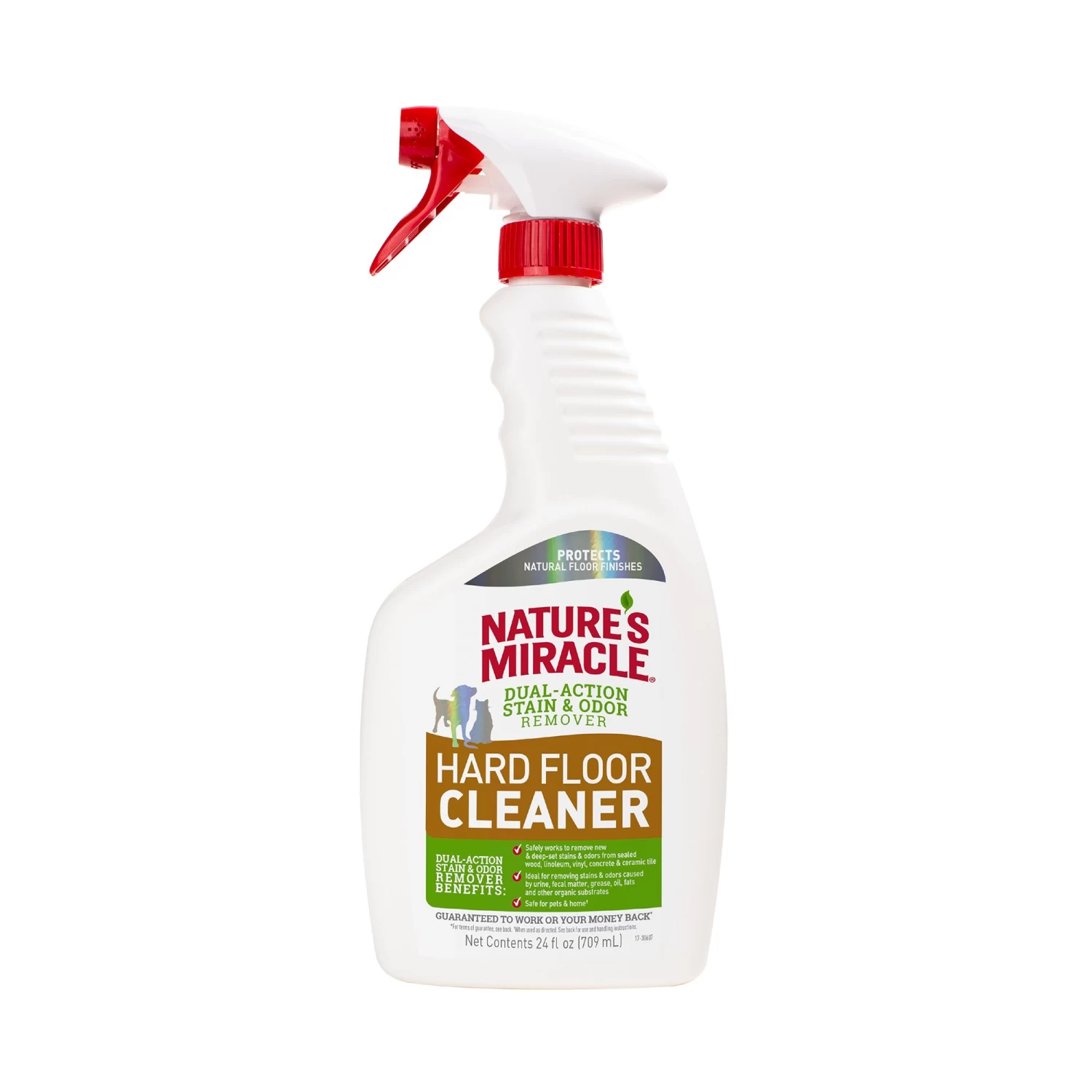 Nature’s Miracle Hard Floor Cleaner is a dual-action pet stain and odor remover ideal for removing stains and odors caused by urine, fecal matter, grease, oil, fats and other organic substrates. The bio-enzymatic formula provides a deep clean while protecting the natural floor finish. Nature’s Miracle Hard Floor Cleaner safely works to remove new and deep-set stains and odors from sealed wood, linoleum, vinyl, concrete and ceramic tile. When used and stored as directed, this product is safe for your pets and home. This product also comes with a money-back guarantee, see label for details.