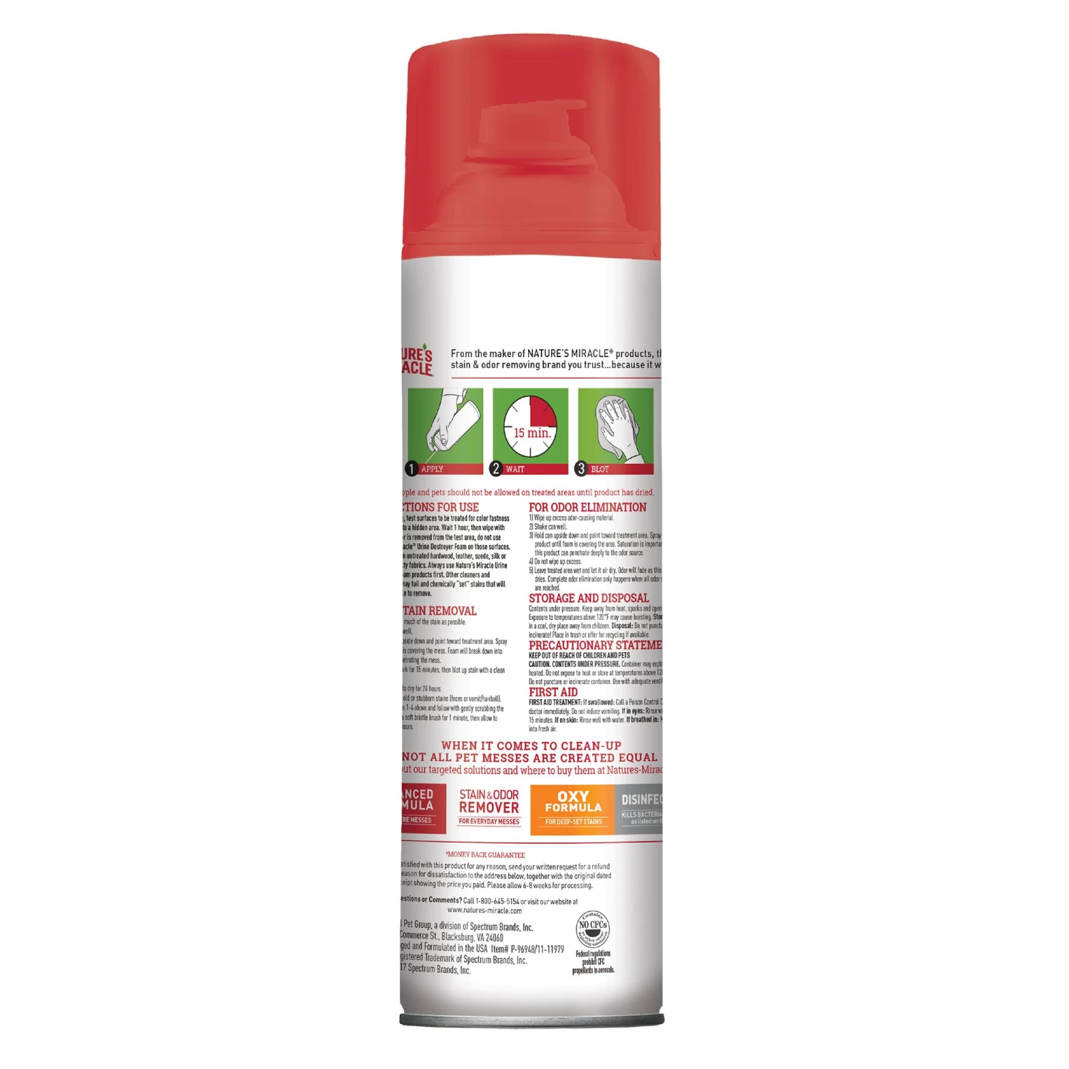 Directions: Wipe up as much of the stain aspossible, then spray Natureâs Miracle Urine Destroyer Foam toward the treatment area. Spray until foam is covering the mess. The foam will break down into the carpet, penetrating the mess. Allow to work for 15 minutes, then blot up with a clean cloth. Do not use on untreated hardwood, leather, suede, silk or wool specialty fabrics. Always use Nature’s Miracle products first. Other cleaners and detergents may fail and chemically “set” stains that will be impossible to remove.