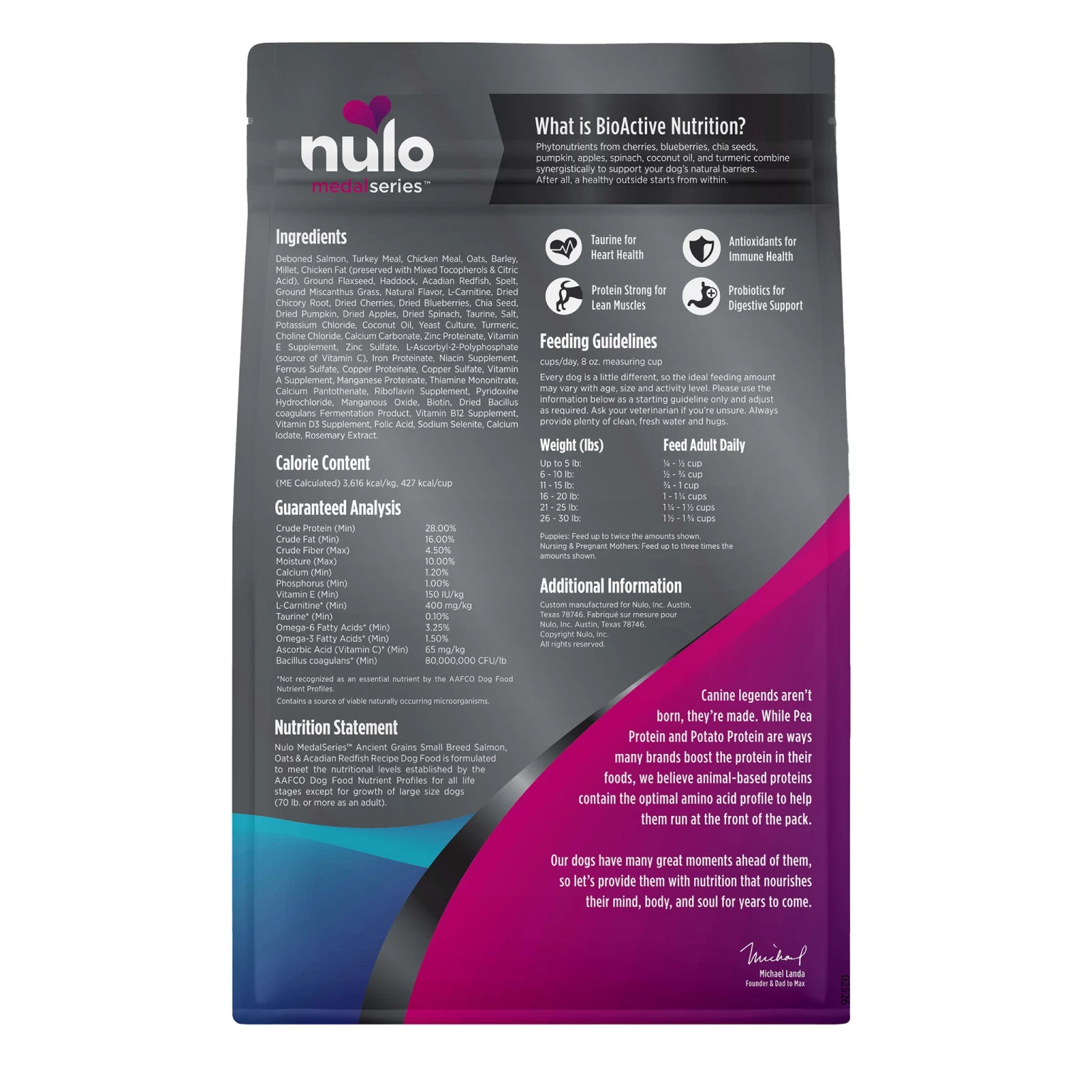Nulo MedalSeries Ancient Grains Small Breed Salmon, Oats, & Acadian Redfish Recipe Premium Dog Food contains animal-based proteins and the optimal amino acid profile to help them run at the front of the pack. Phytonutrients from cherries, blueberries, chia seeds, pumpkin, apples, spinach, coconut oil, and turmeric combine synergistically to support your dog’s natural barries. After all, a healthy outside starts from within