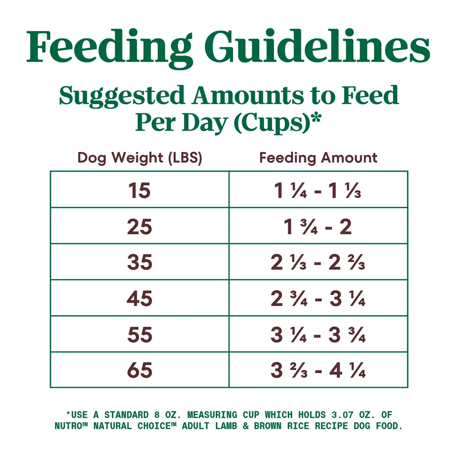 *Use a standard 8 oz. measuring cup which holds 3.10 oz. of NUTRO NATURAL CHOICE Adult Lamb & Brown Rice Recipe Dog Food.