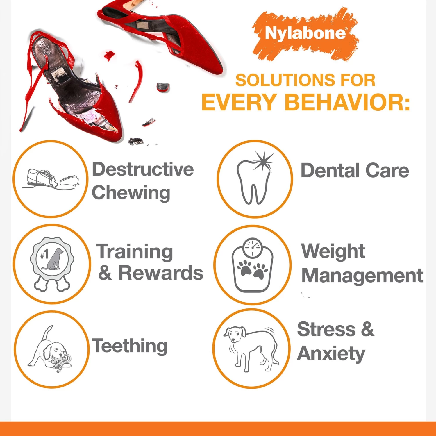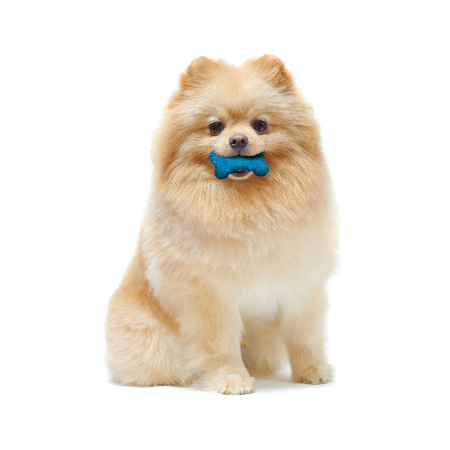 Nylabone Moderate Chew FlexiChew mini chew toys are the perfect pastime for your tiny dog! Easy for the tiniest dogs to hold and carry, each long-lasting chew toy is packed with flavor: one in yummy peanut butter and the other in irresistible bacon. It’s a delicious, sweet-and-savory combo your pup will love. These dog chew toys are made of softer, flexible material for lighter chewers. The textured bone shape also helps clean your dog’s teeth and reduce plaque and tartar buildup for fresher breath. Suitable for dogs up to 8 lbs.