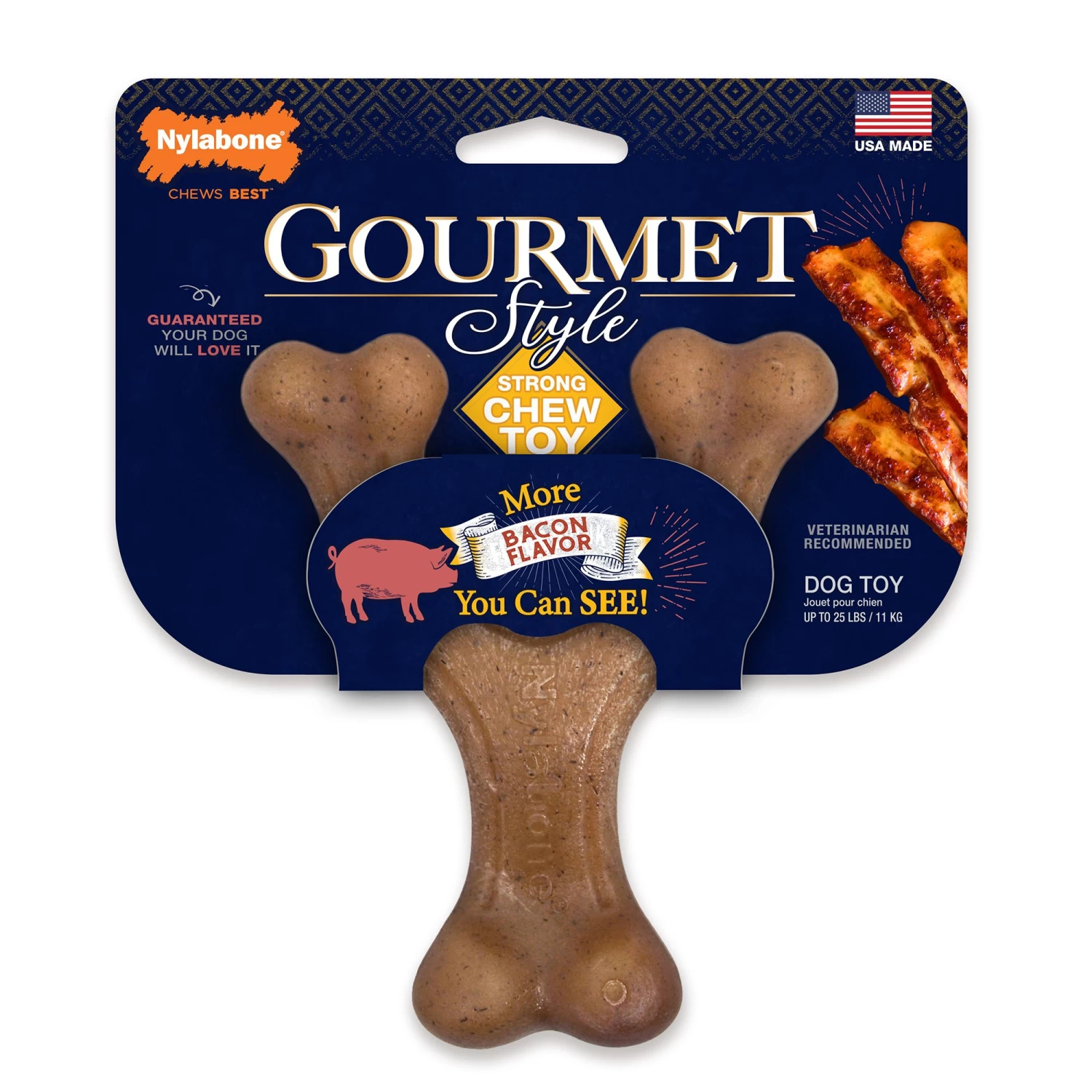 The Nylabone Gourmet Bacon Wishbone Dog Toy is uniquely crafted with bold bits of gourmet flavor roasted throughout. Its arched design is comfortable for dogs to chew from any angle, and it is made of tough material for long-lasting enjoyment. For more powerful chewers, try Nylabone Power Chew Toys. This universally loved wishbone shape looks like the real thing, but is safer and cleaner than sticks found in the outdoors. With its gourmet flavor roasted throughout, it is also a far more delicious alternative! Plus, this stick dog toy has a unique texture that helps clean teeth as dogs Nylabone’s Gourmet Style chew toys are made to wow flavor-obsessed dogs who crave a new type of chewing experience.