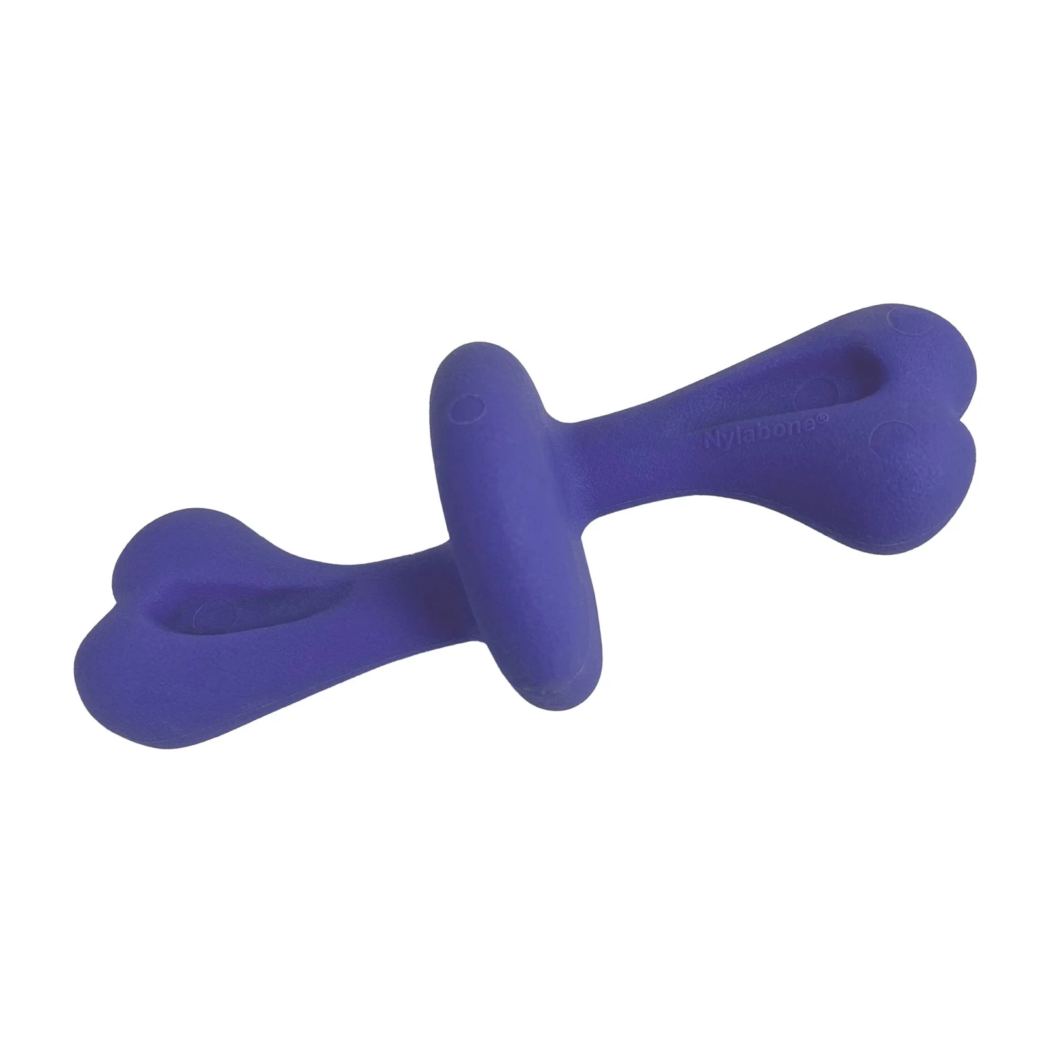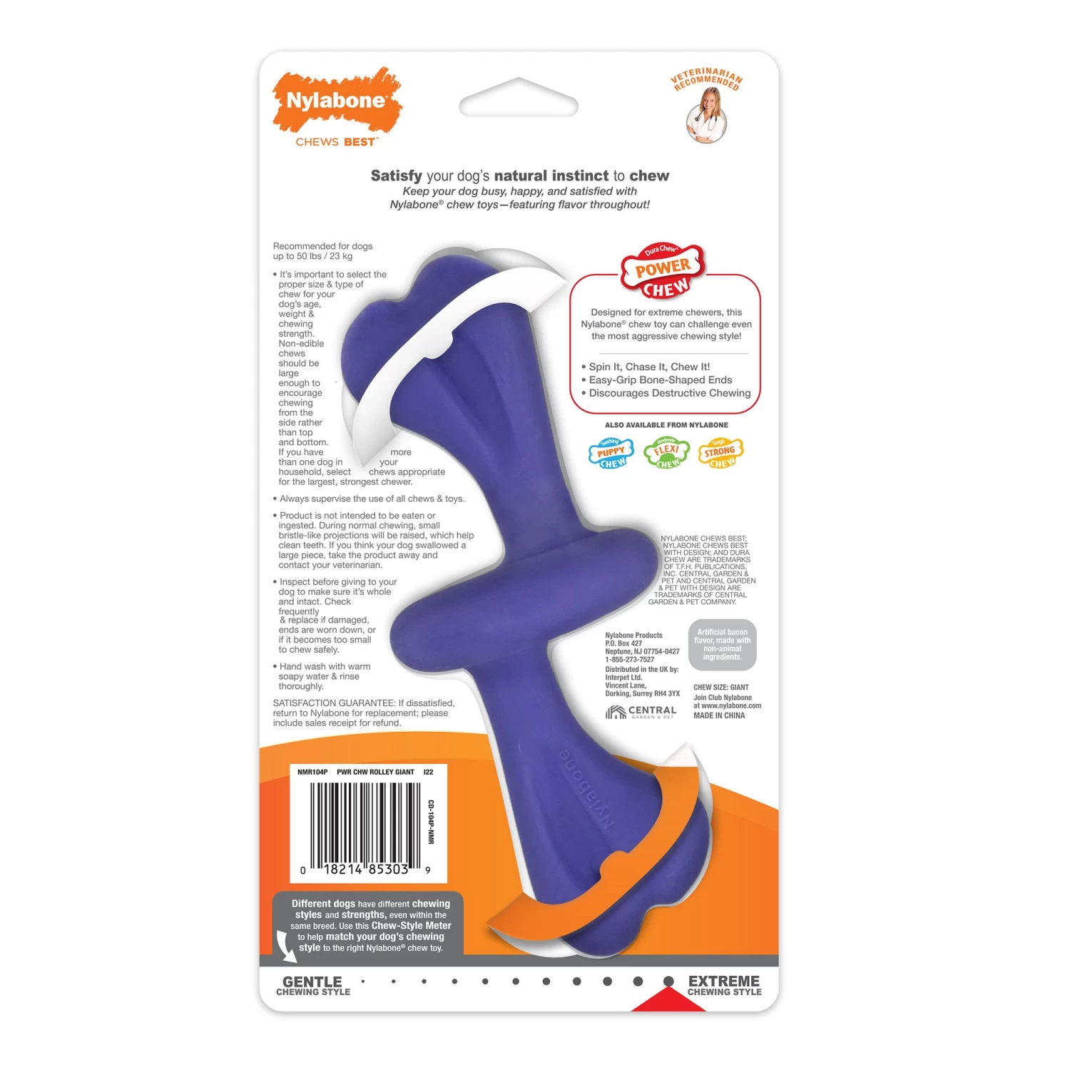 Watch your dog spin and chase the Nylabone Power Chew Rolling Dog Toy as they enjoy an exciting twist on chew time! This chew toy features two easy-grip bone-shaped ends that are comfortable to hold and chew. Plus, it helps clean teeth as dogs chew to promote a happy and healthy smile! Made from our most durable material, this dog chew toy challenges and entertains even the most powerful chewers. Satisfy your best friend’s natural urge to chew with this fun dog toy!