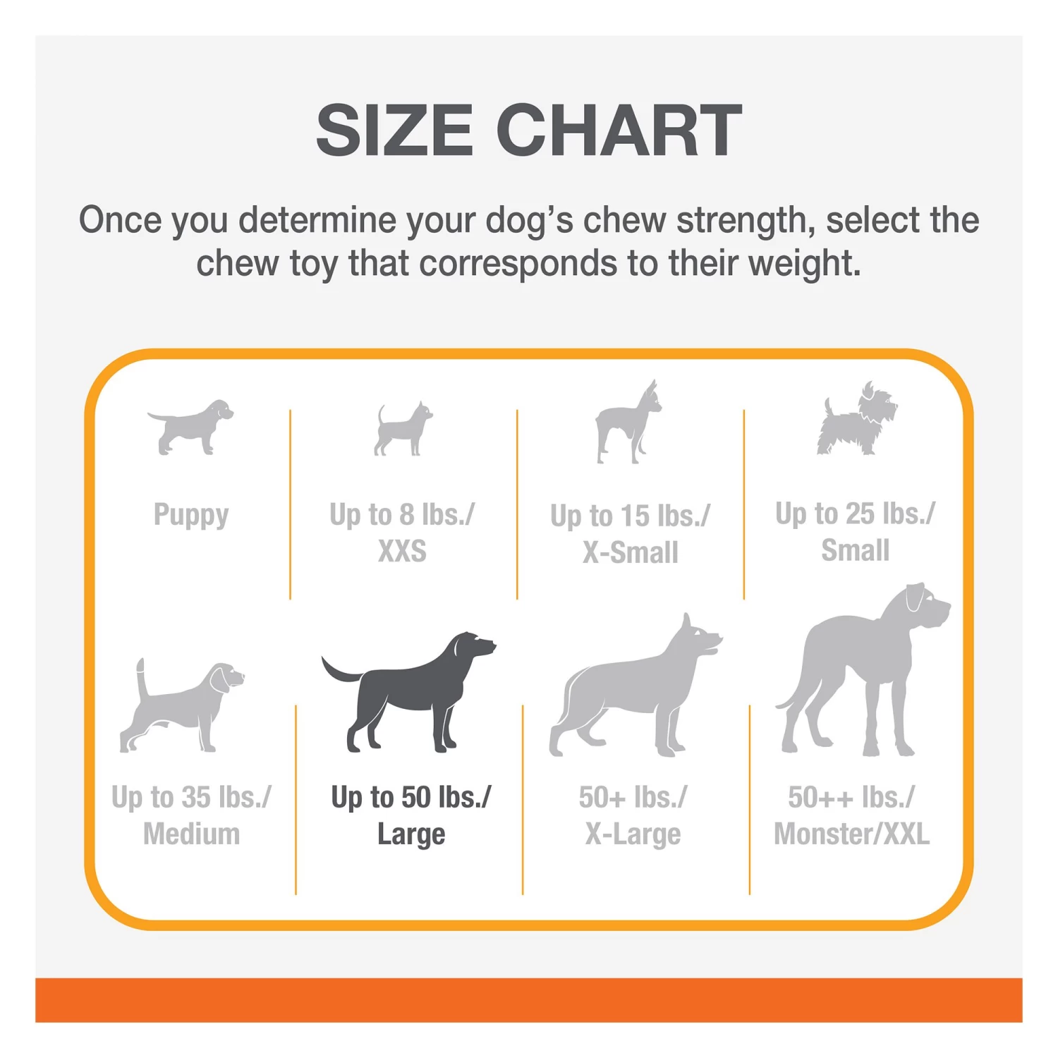 It’s important to select the proper size & type of chew for your dog’s age, weight & chewing strength. Non-edible chews should be large enough to encourage chewing from the side rather than top & bottom. If you have more than one dog in your household, select chews appropriate for the largest, strongest chewer. Always supervise the use of all chews & toys. Products not intended to be eaten or ingested. If you think your dog swallowed a piece, take the product away and contract your veterinarian. Inspect before giving to your dog to make sure it’s whole and intact. Check frequently & replace if worn or damaged or if it becomes too small to chew safely.