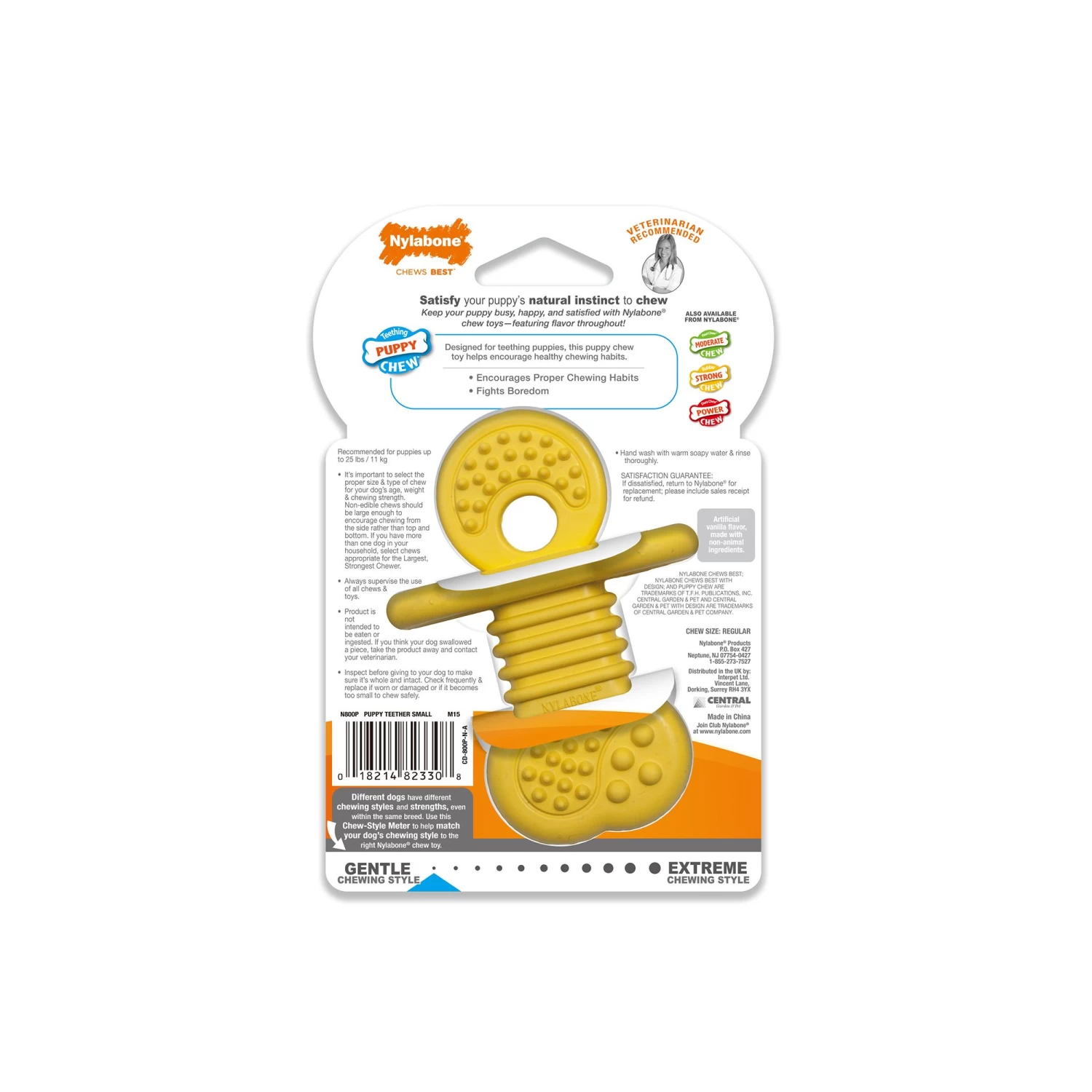 The Nylabone Vanilla Puppy Rubber Teether is made from natural rubber to satisfy the chewing instinct of teething puppies and encourage non-destructive chewing. Bristles raised during chewing will help clean teeth and prevent tartar build up. Designed for teething puppies – not recommended for adult dogs or puppies with any permanent teeth.