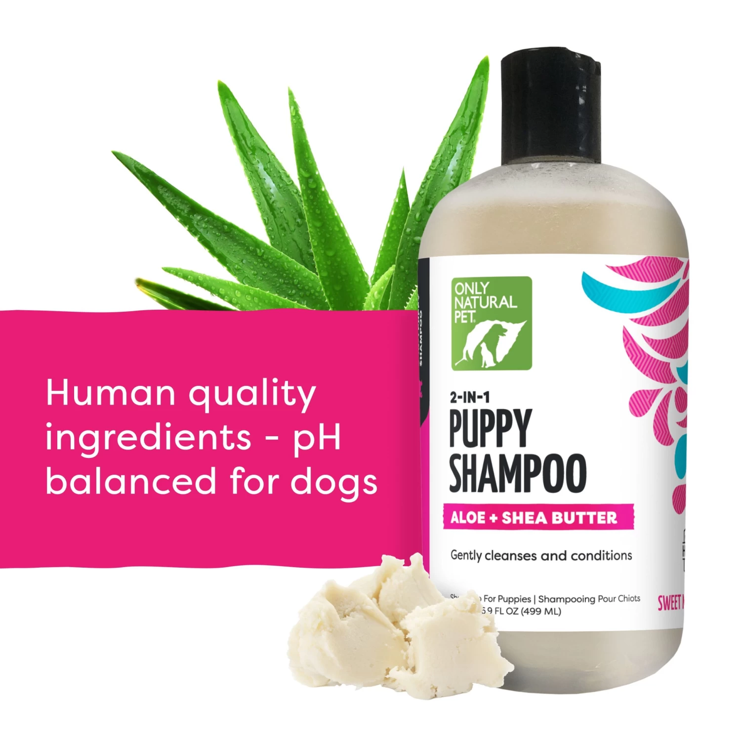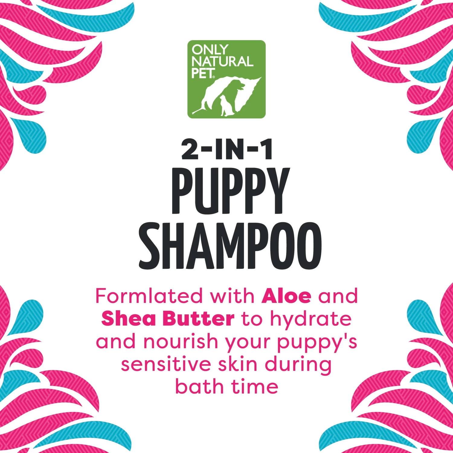 ONLY NATURAL PET 2-IN-1 PUPPY SHAMPOO is a moisture-rich blend of Aloe and Shea Butter, formulated to naturally cleanse and nourish your puppy’s fur and skin. Plant-based ingredients gently cleanse and condition without the use of harsh detergents or chemicals. Aloe and Shea Butter are ideal to revitalize and hydrate sensitive skin and coats.