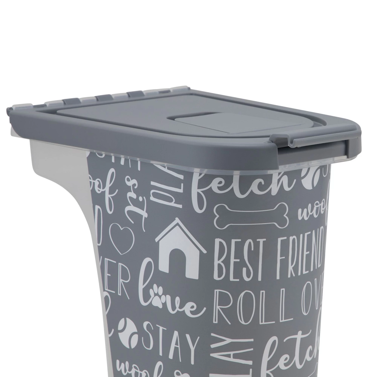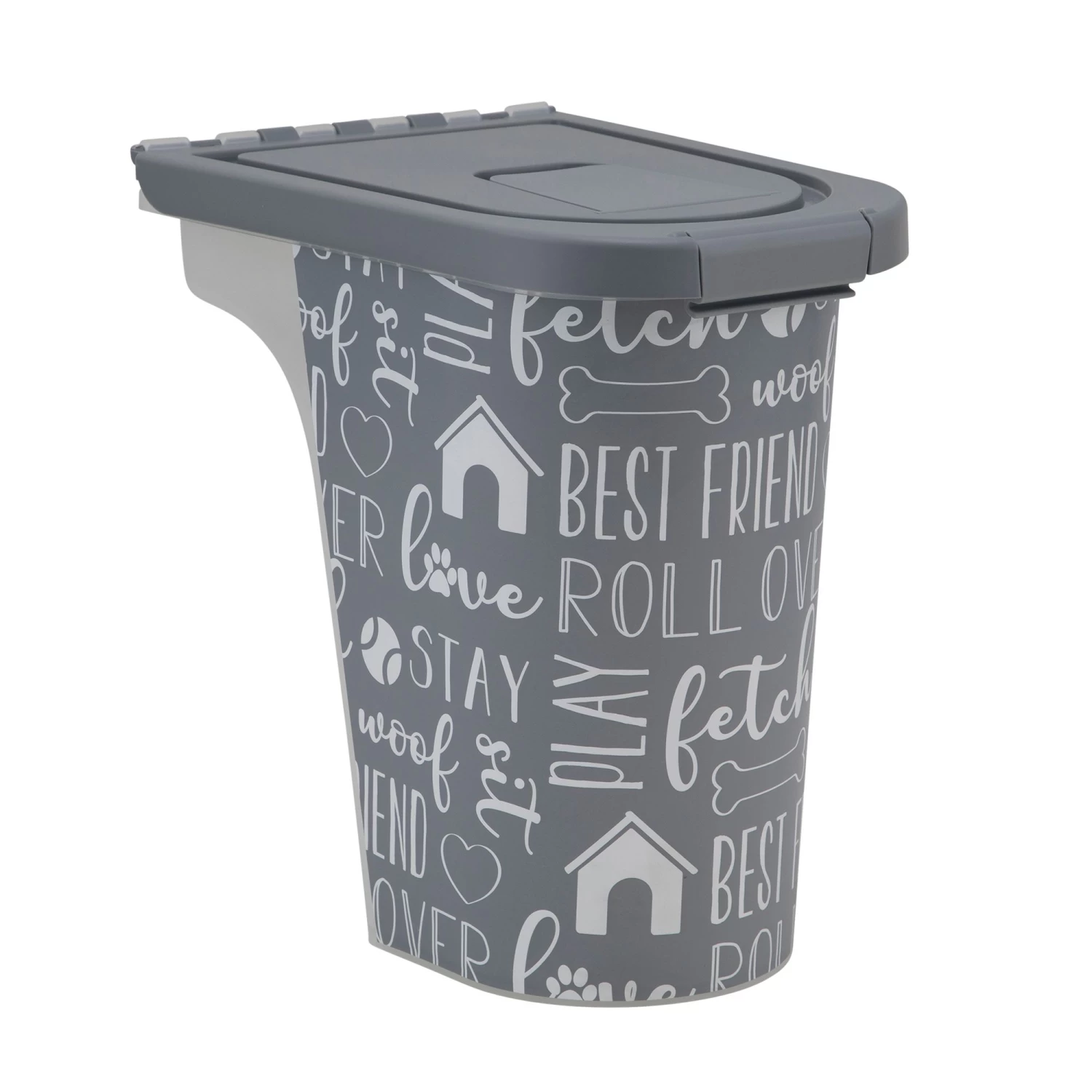 keep your dog’s food fresh and safe in one place with this Paw Prints Grey Food Dispenser. This dispenser features a cover that opens to put up to 7 lbs of food in, as well as a a spout on top that opens to pour food out. Its design also features a variety of fun dog-related sayings that is fun and fashionable. Only at PetSmart.