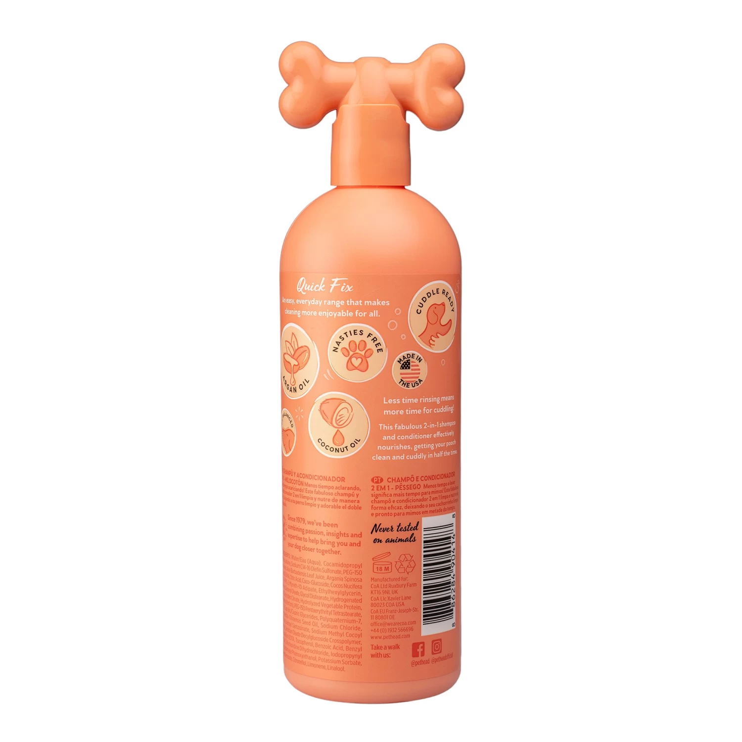 Pet Head Quick Fix 2 in1 Shampoo means less time rinsing and more time cuddling. This fabulous 2-in-1 shampoo and conditioner effectively nourishes, getting your pooch clean and cuddly in half the time. Its amazing peach fragrance is very popular, and sweet, nectarous and powdery with a fruity note that confers a softness and gentleness to our pooches. This quick fix, shampoo & conditioner contains 3 amazing oils – Argan, Coconut and Jojoba oil – that all work to provide softness while nourishing your pooch’s skin and coat.