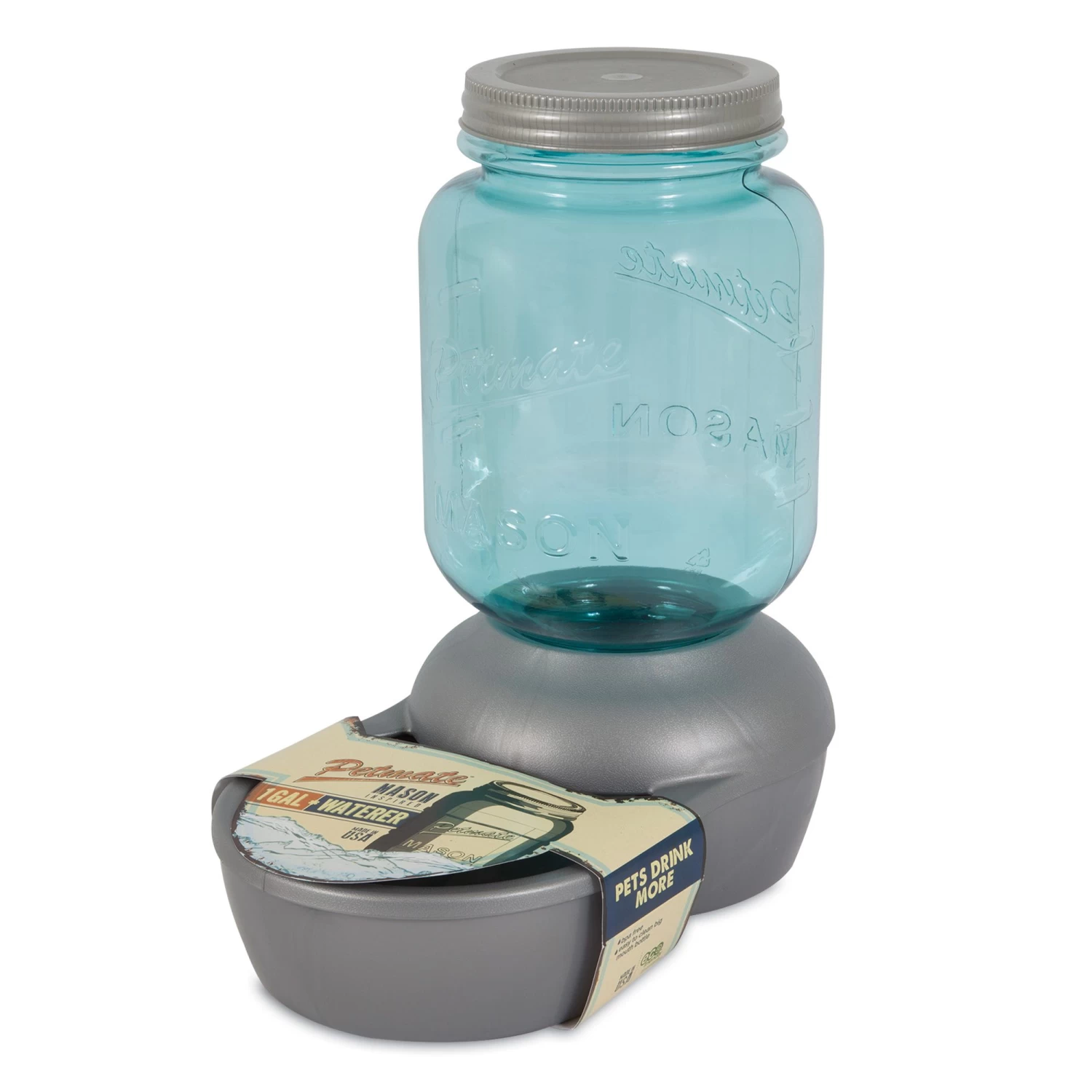 The convenient Petmate Mason Inspired Waterer encourages pets to drink more water. The big mouth bottle makes clean up a breeze. The filtered waterer removed impurities and provides your pet with better tasting water.